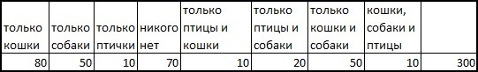 это 1.1, 1.3, 1.4 множества: 50-10-10-20=10 есть только птицы.