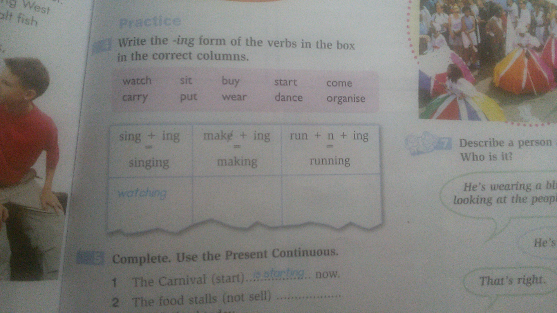 sitting, buying, starting, coming, carrying, putting, wearing, dancing, organizing