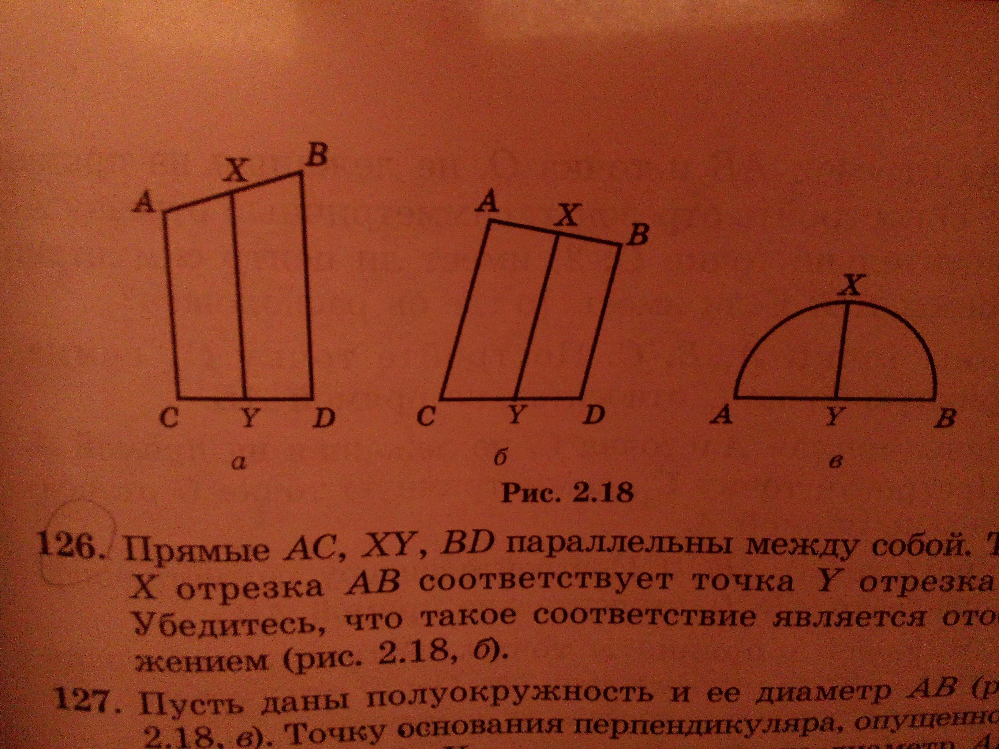 Прямые AC, XY, BD параллельны между собой. Точке X отрезка AB соответствует точка Y отрезка CD. Убедитесь, что такое соответствие является отображение(рис. 2.18, б).