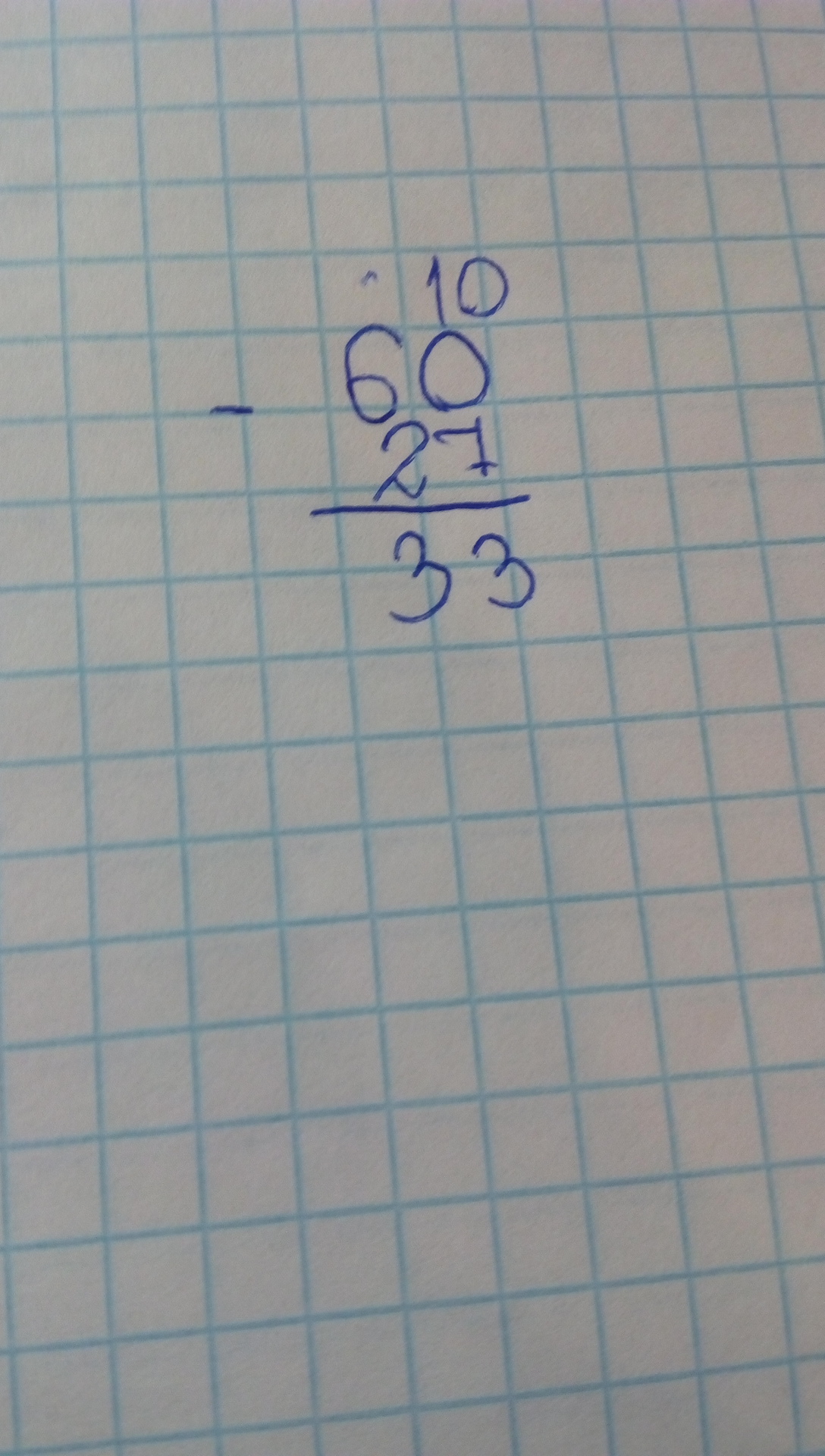 занимаем 1 десято в 1 десятке 10 едениц у нас 60 да заняли 10 50 и из 50 вычитать 27 и все если не понятно надо вот так писать