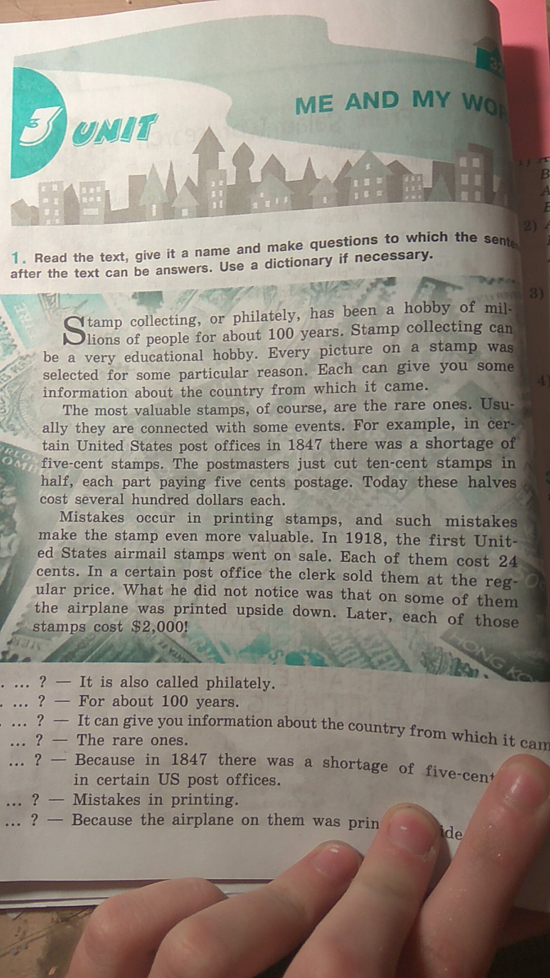 1. Прочитайте текст, дать ему имя и сделать вопросы, к которым s после текста можно использовать необходимо. набейте сбора или филателии, было хобби мил львов людей в течение приблизительно 100 лет. Филателия может очень хобби. изображение на марке была выбрана для какой-то причине. Каждый из них может дать вам так конкретную информацию о стране, из которой он пришел из самых ценных марок, конечно, редкие из них. Usu союзник они связаны с некоторыми событиями. Например, в CER TAIN почтовых отделений Соединенных Штатов в 1847 году была нехватка пяти центов марок. В почтмейстеры просто вырезать десять центов марки пополам, каждую часть платит пять центов почтовые расходы. Сегодня эти половинки стоят несколько сотен долларов каждый. Ошибки возникают при печати марок и такие ошибки rnake печать еще более ценным. В 1918 году первый блок ред авиапочтовая марка государства поступили в продажу. Каждый из них стоил 24 центов. В определенном почтовом отделении клерк продал их по рег лярного цене. что он не заметил, что на некоторых из них самолет был напечатан вверх ногами. Позже, каждый из этих марок стоят $ 2000! Его также называют филателии. В течение примерно 100 лет. Он может дать вам информацию о стране, из которой он CAM-редкие. Потому что в AT был дефицит пяти центов в некоторых почтовых отделениях США. Ошибки при печати.