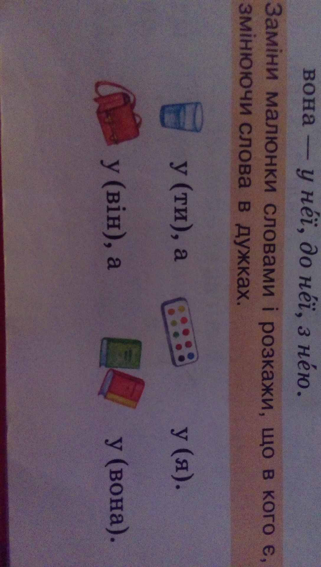 у тебе склянка з водою,а у мене фарби.У нього ранец,а у неі книжки