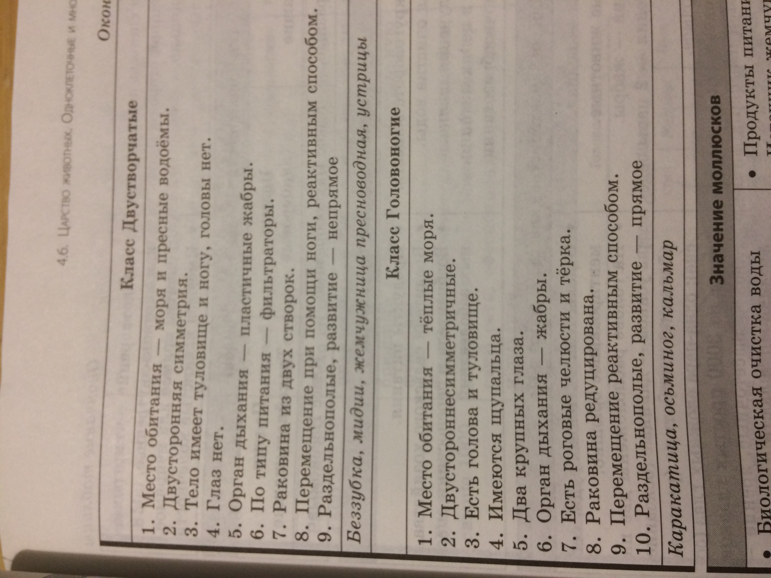 сравнительная характеристика класса моллюсков;Класс Брюхоногие,Класс Двусторчатые,Класс Головоногие