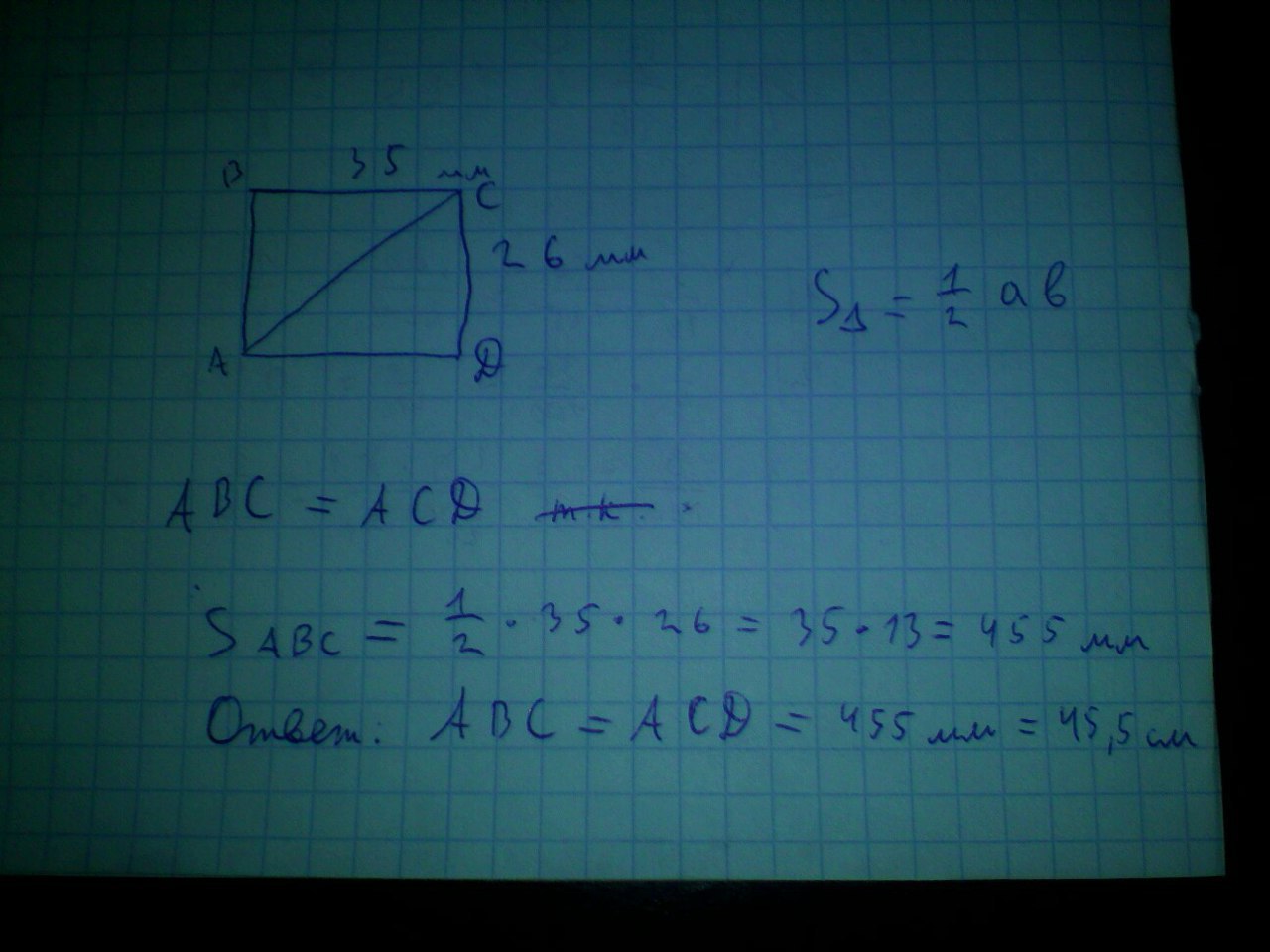 начерти прямоугольник,размеры которого 35 им и 26 им. проведи диагональ прямоугольника. как вычислить площадь каждого из получившихся треугольников