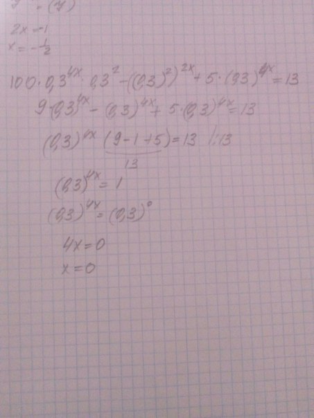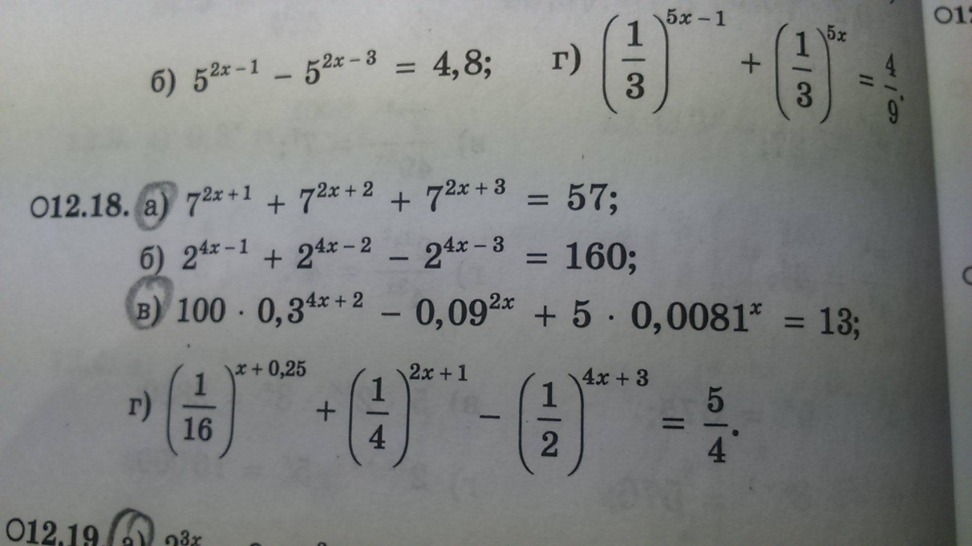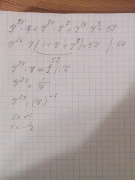 а)7^2x *7+7^2x *7^2+7^2x*7^3=57 а теперь просто выносим общие множители и получаем 7^2x *7 (1+7+49)=57 обе части делим на 57 получаем 7^2x*7=1 т.е 7^2x=1/7 7^2x=7^(-1) 2x=-1 x=-1/2 по тому же принципу делается вторая