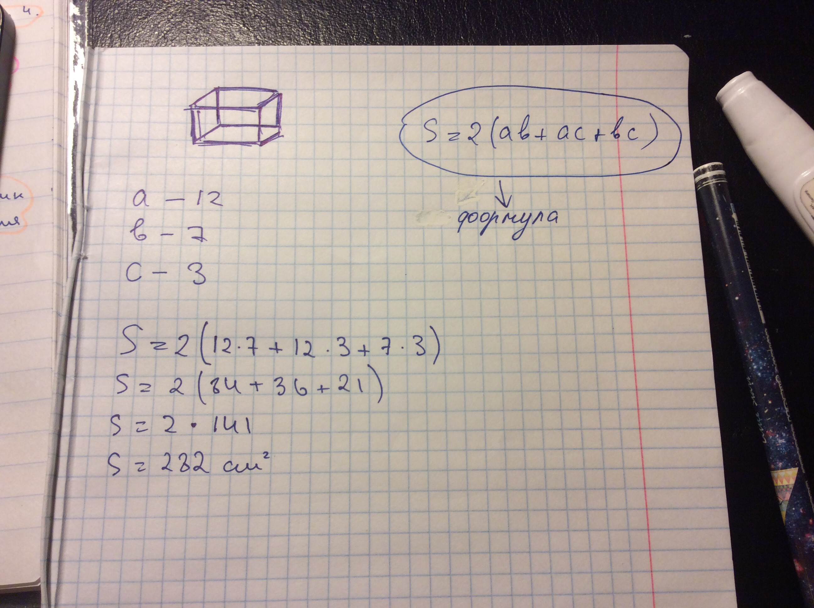 дан прямоугольный паралелепипед его длина равна равна 12 см,ширина-7 см,высота-3 см найдите площадь поверхности паралелеппеда