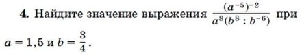 в числителе а в 10,в знаменателе а в 8 на б во 2. будет а во 2 на б во 2. при а=1.5 б=3/4,то 1.5 * 1.5 в числителе в знаменателе 3/4 *3/4= 2.25: 9/16=4