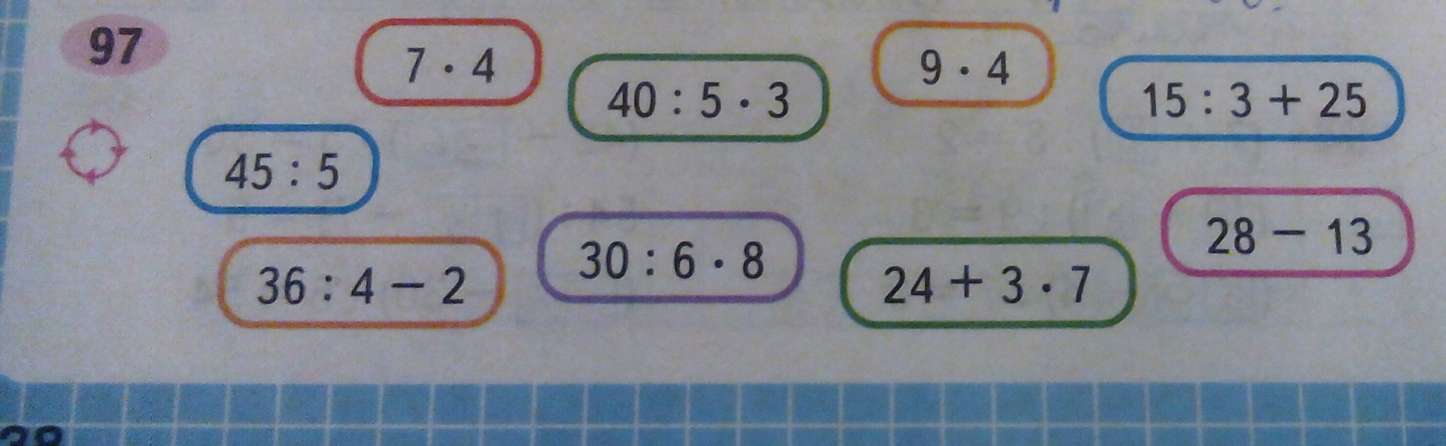 например 9*4=39 дальше стрелочка к следующему номеру, чтобы пример начинался с этого числа 36 / 4 - 2 =7 и т.д