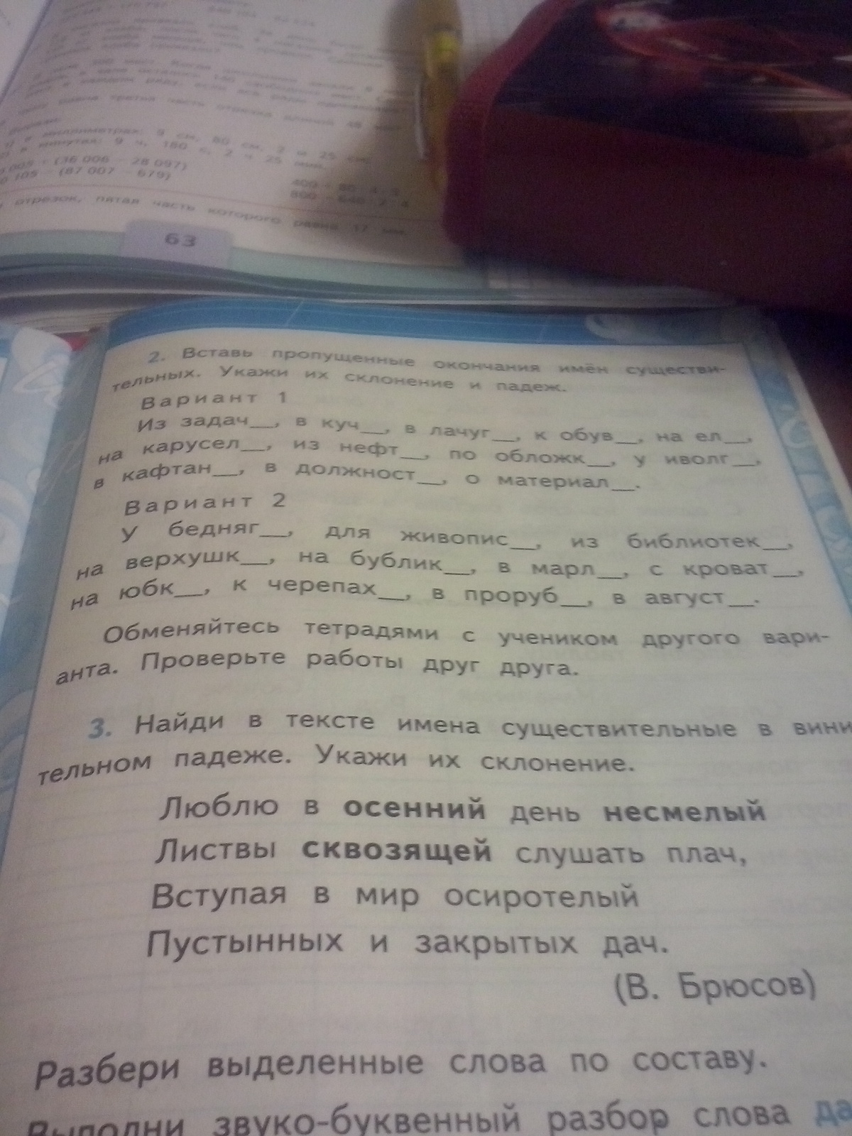 Из задачи (1 склонение, Р.п.), в куче (1 скл, предложный падеж) в лачуге (1 скл, предложный п. )к обуви(3 скл. Дательный п. )на ели (3 скл. Предложный п. ) на карусели (3 скл. Предл.п.) из нефти (3 скл. Родит. П. ) по обложке (1 скл. Дат.п. ) у иволги (1 скл. Р.п.), в кафтане ( 2 скл., предл.п.), в должности (3 скл. Предл.п.), о материал (2 скл. Предл. П)