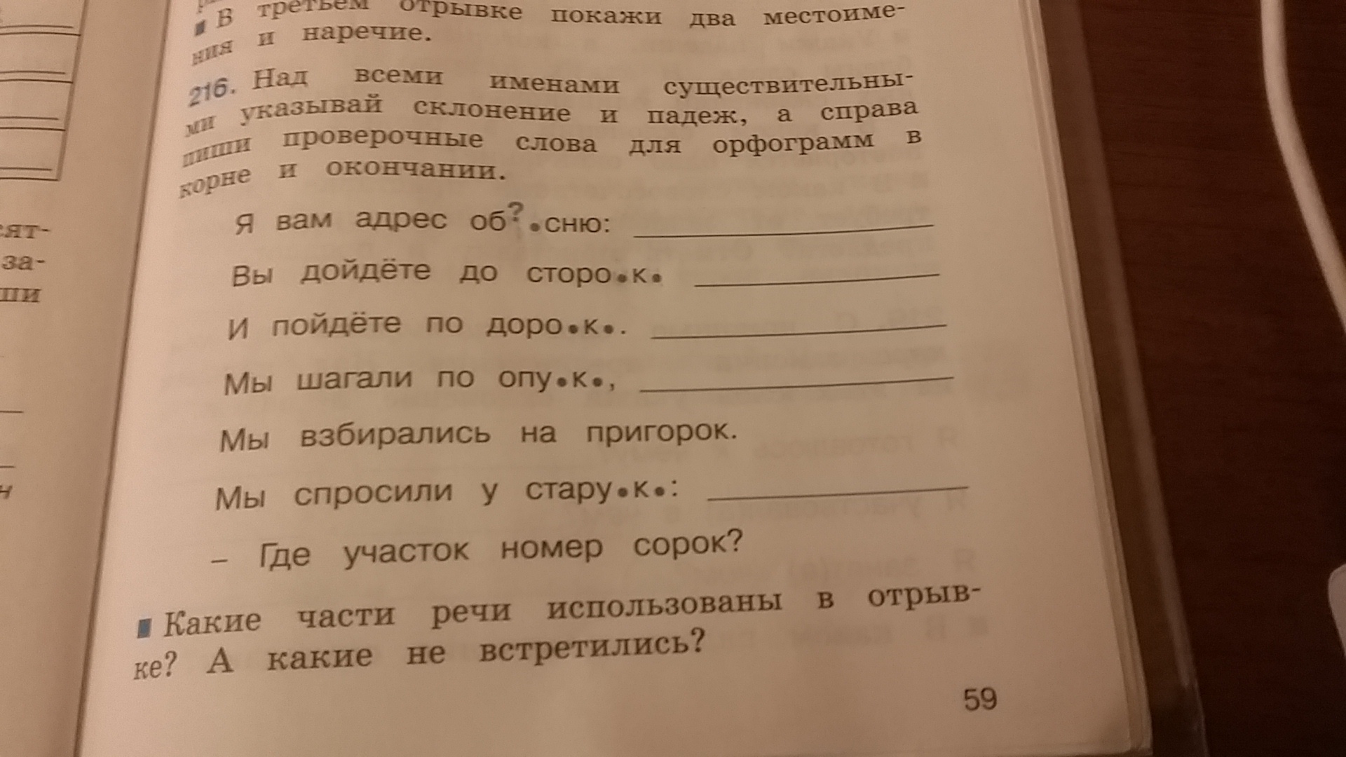 Встретились: существительное, глагол, местоимение, числительное, предлог. Не было: наречие, прилагательное.