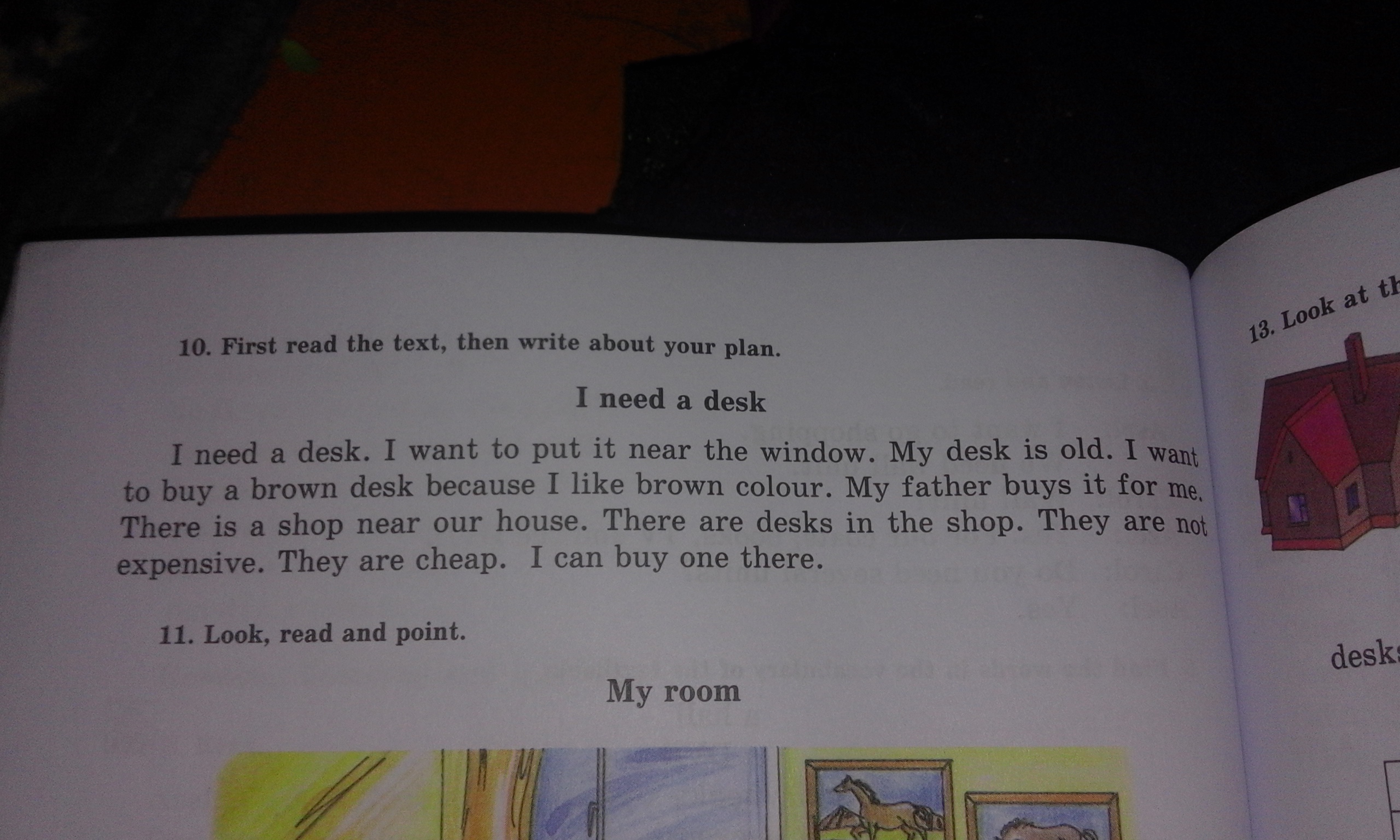 Мне нужен письменный стол. Я хочу поставить его возле окна. Мой столик старый. Я хочу купить коричневый письменный стол, потому что мне нравится коричневый цвет. Мой папа купит его для меня. Это в магазине рядом с нашим домом. В магазине письменные столы. Они не дорогие. Они дешевые. Я могу купить один.