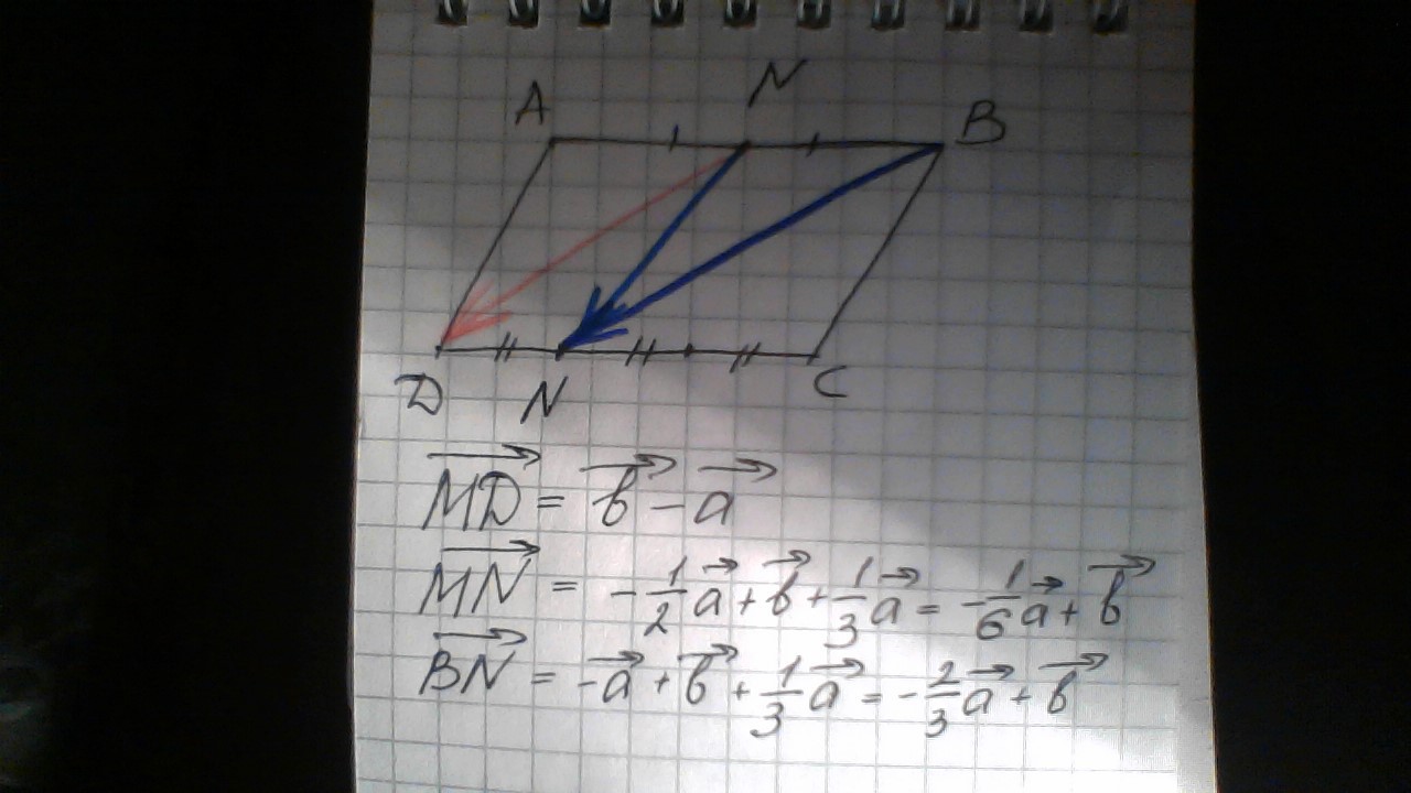 в параллелограмме ABCD точка M середина стороны АВ, а точка N делит сторону СД в отношении 2:1 считая от точки С выразите векторы МД BN MN через векторы а=AB в=AD