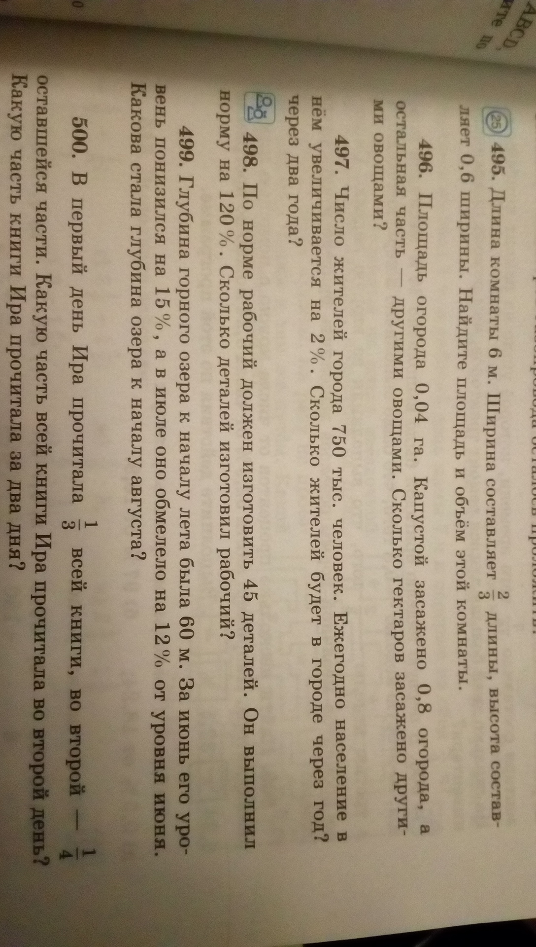 № 499. На 1.06 глубина была 60 м - это 100%. К 1.07 обмелело на 15%, т. е. стала 85% от 1.06. Находим, какова глубина на 1.07: 60 х 0,85 = 51 (м). Т. к. к 1.08 глубина уменьшилась на 12% от глубины на 1.07, то теперь глубина на 1.07, равная 51 м, - это 100%, а на 1.08 уже будет 88%. Находим: 51 х 0,88 = 44,88 (м). Ответ: на 1.08 глубина озера стала 44,88 метра.