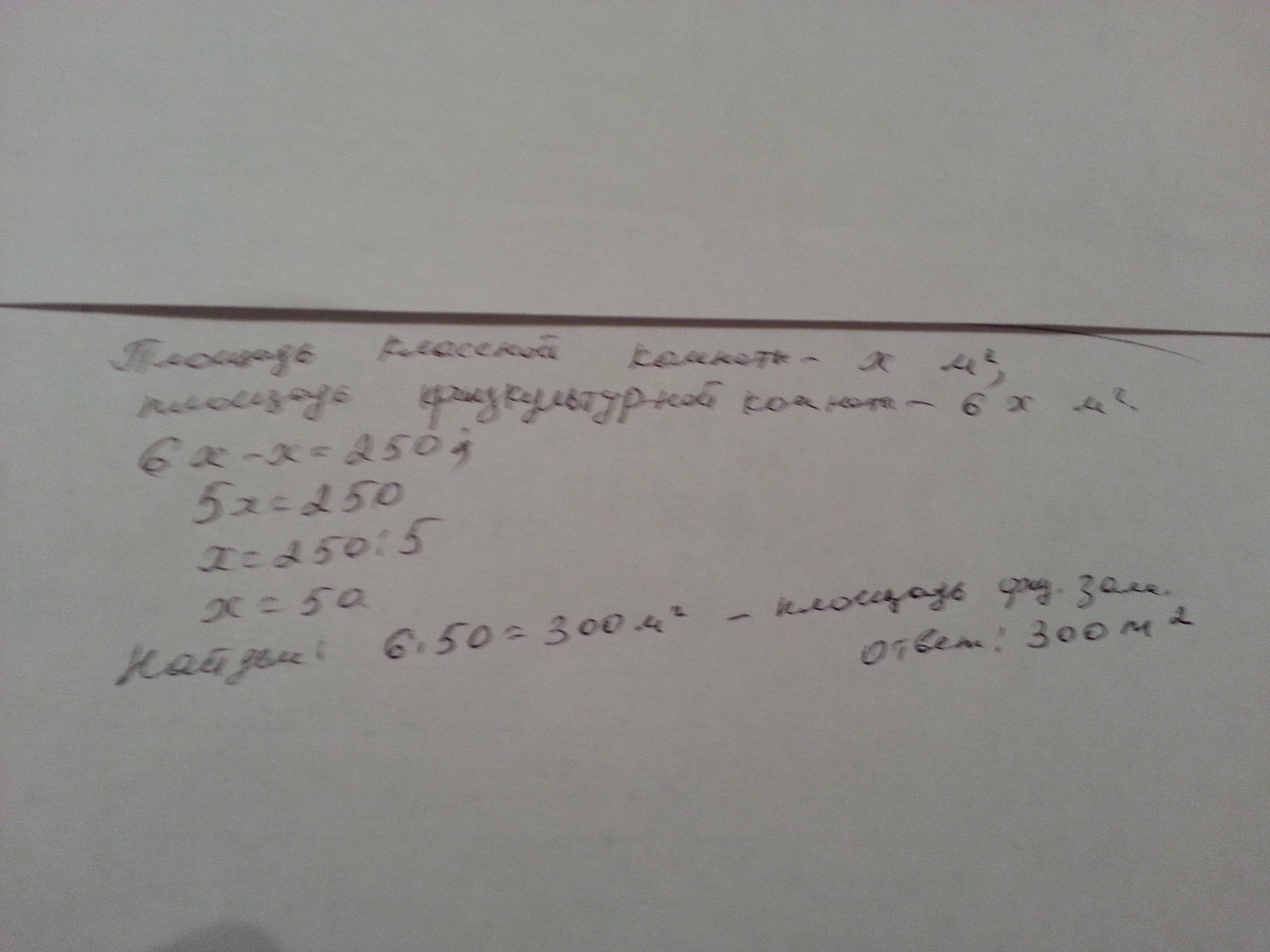 Решите пож:Площадь физкультурного зала 6 раз больше площади классной комнаты .Найдите площадь зала, если она больше площади классной комнаты на 250м².
