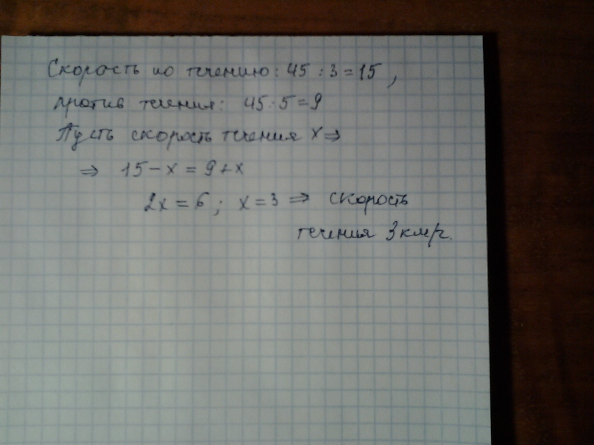 Расстояние между речными портами 45 км. Моторная лодка проходит этот путь по течению за 3 часа и против течения за 5 часов. Вычислите скорость течения реки, если скорость лодки в стоячей воде постоянна.
