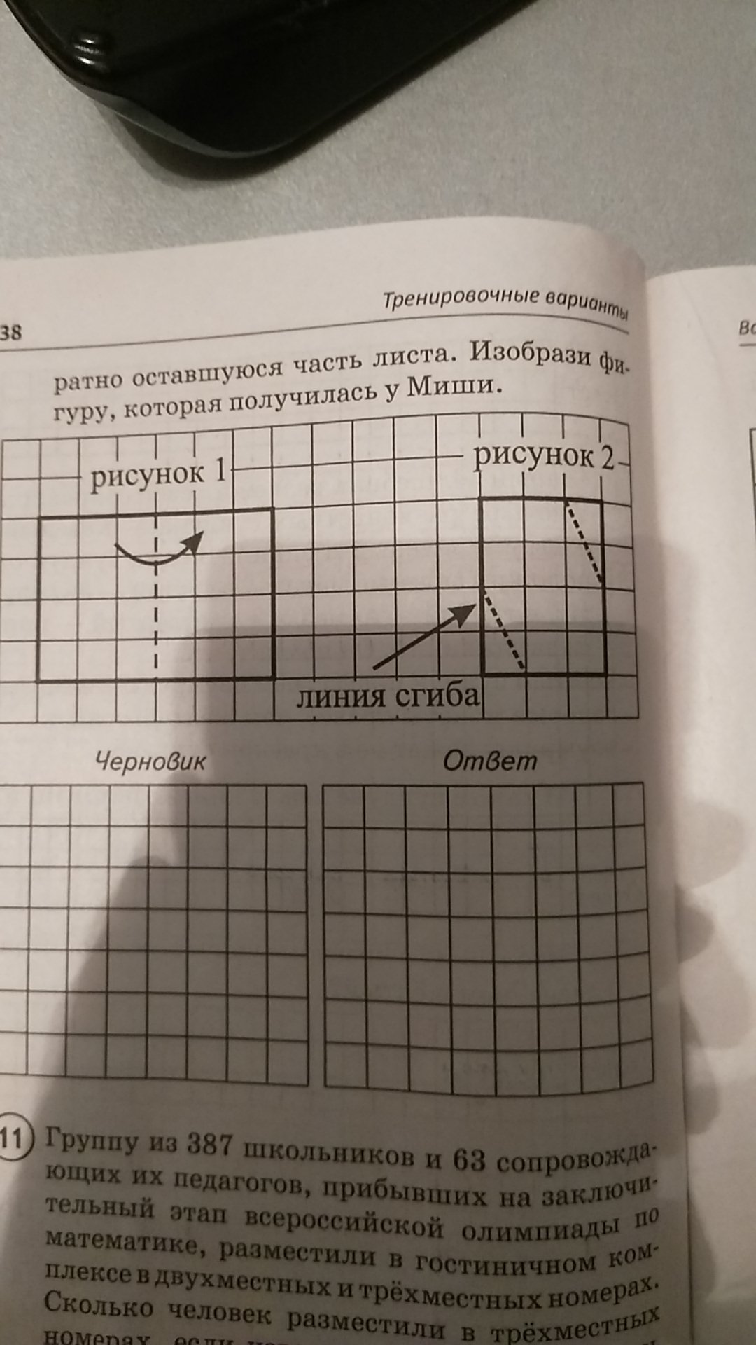 Миша сложил пополам прямоугольный лист бумаги размером 4*6 клеток в доль отмеченной пунктиром линии, смотри рисунок 1. При этом получился прямоугольник 4 на 3 клетки, от которого Миша отрезал ножницами два угла вдоль линий, отмеченных пунктиром на рисунке 2. После этого Миша развернул обратно оставшуюся часть листа. Изобрази фигуру которая получилась у Миши.