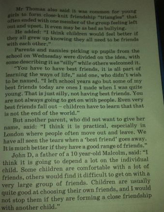 а) Издевательства в школе: Рекомендации для семей б) должны дети имеют самые лучшие друзья? в) Лучшие друзья заставит вас чувствовать себя одиноким г), который нуждается Лучшие друзья в эти дни? Руководитель преподаватель ведущей начальной школы Хар сказал маленькие дети не должны быть лучшими друзьями потому что это может оставить другие чувства одиночества и боли. Besties, лучшие подруги, что вы хотите назвать их. много детей ищет лучшего друга и ребенка. капот мат представляет собой типичный мотив детской литературы Тома Сойера и Гекльберри Финна или крысиные и Моль. Это может стать неожиданностью, что родители учеников в школе на юго-западе Лондона было сказано, что это не очень хорошо для своих детей, чтобы иметь лучшие друзья. И это "здоровым" для ребенка, чтобы иметь "много хороших друзей", чем лучшего друга. Бен Томас, директор школы, сказал: "Есть слишком много проблем с наличием BF, как управлять поведением лин или осадку выпадений, и это гораздо проще, если дети разделяют дружбу и иметь много хороших друзей, а не слишком беспокоиться много о том, кто их лучший друг