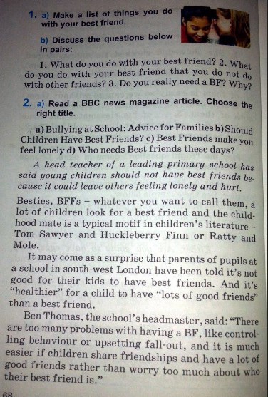 Пожалуйста,помогите перевести текст(упр.2a и 2b вопросы тоже перевести) начиная с Besties и дальше,и озаглавить его с помощью предложенных вариянтов .