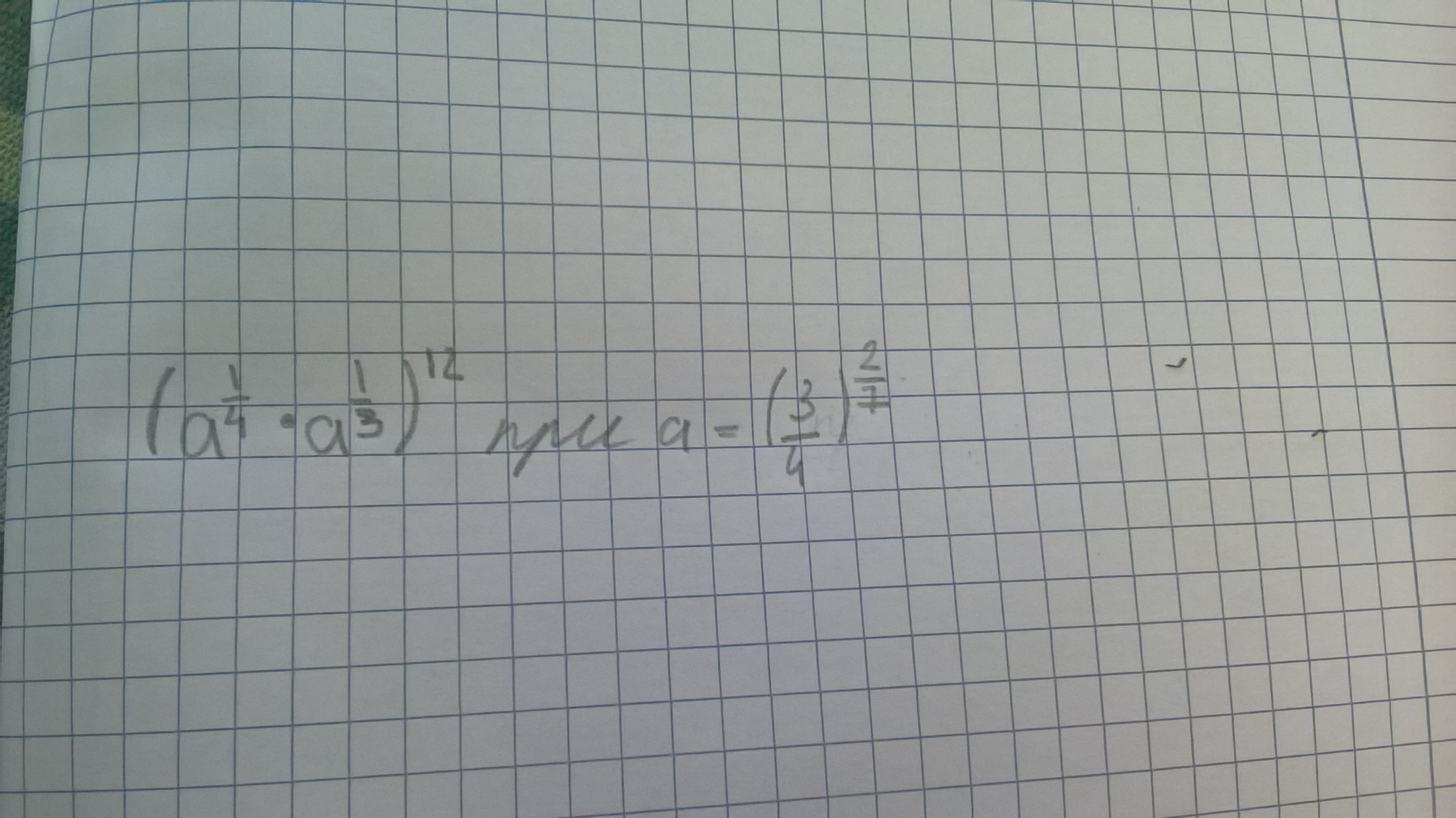 left(a^{frac14cdot a^{frac13}}right)^{12}=left(a^{frac14+frac13}right)^{12}=left(a^frac7{12}right)^{12}=a^{frac7{12}cdot12}=a^7\a=left(frac34right)^{frac27}\a^7=left(left(frac34right)^frac27right)^7=left(frac34right)^{frac27cdot7}=left(frac34right)^2=frac9{16}