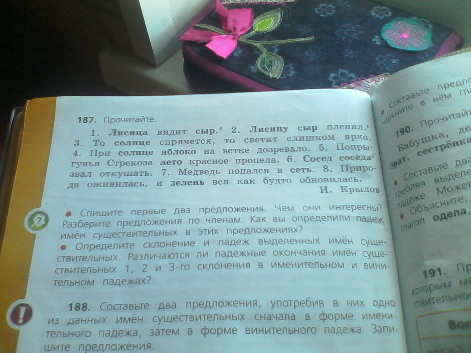Сыр- И.п., 2-ое скл., лисица- И.п., 1-ое скл., солнце- И.п., 2-ое скл., яблоко- И.п., 2-ое скл., зелень- И.п., 3-е скл.,
