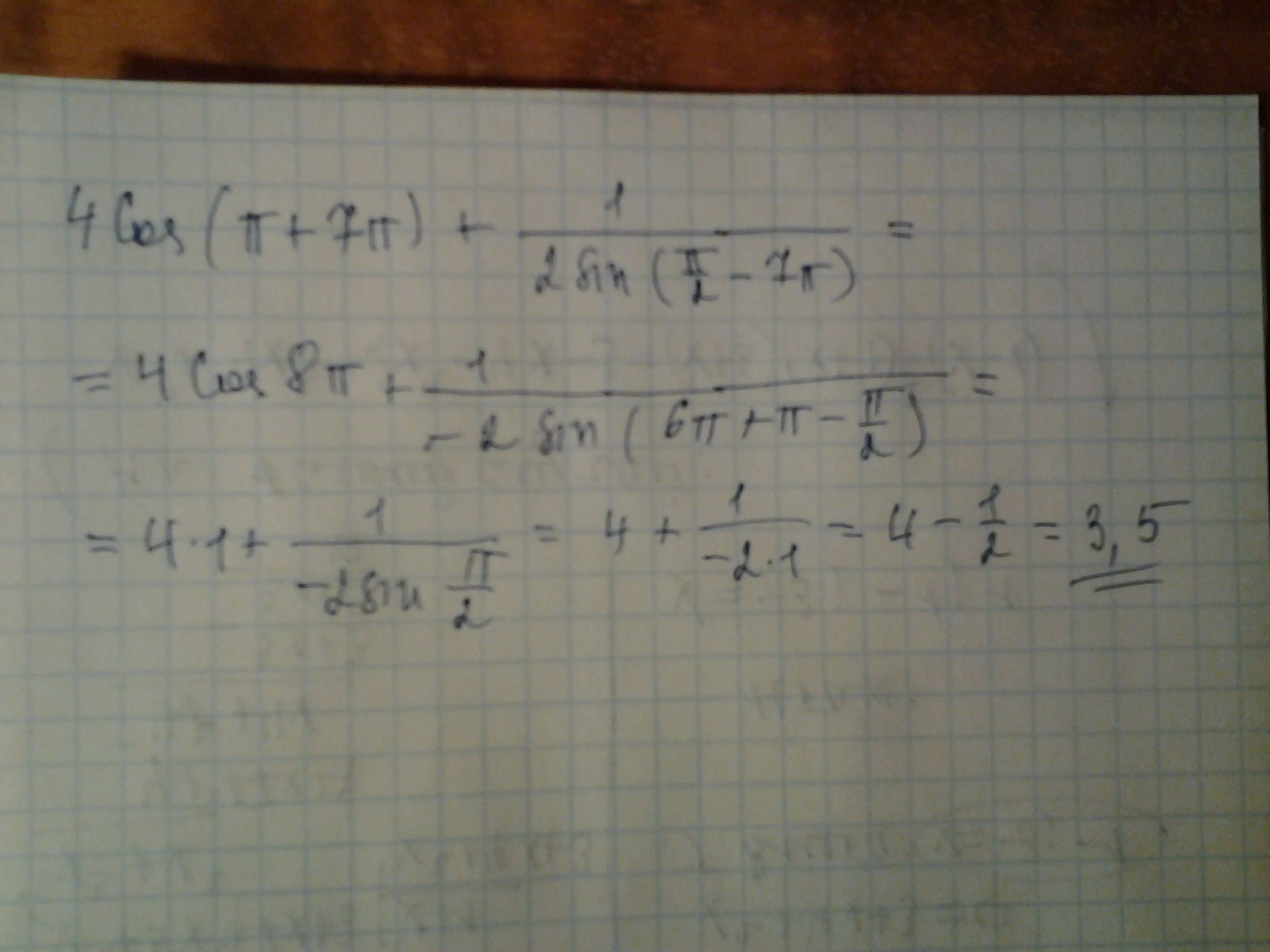 4cos(pi+альфа )+1/2sin(pi/2-альфа) если альфа=7pi 1)-4,5; 2)3,5; 3)4,5; 4)-3,5