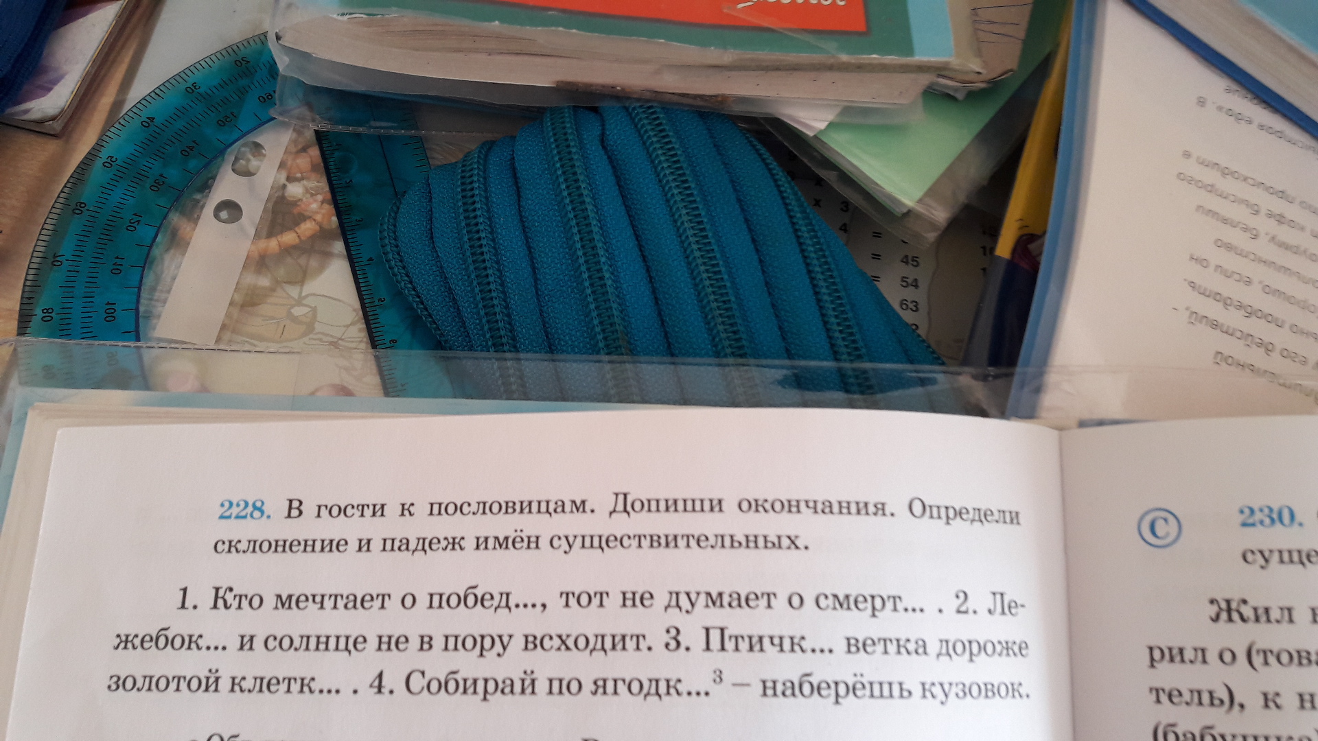 1.Кто мечтает о победе (предложный падеж), тот не думает о смерти (предложный падеж). 2.Лежебоке (дательный падеж) и солнце не в пору всходит. 3.Птичке (дательный падеж) ветка дороже золотой клетки. 4.Собирай по ягодке (дательный падеж) - наберёшь кузовок.