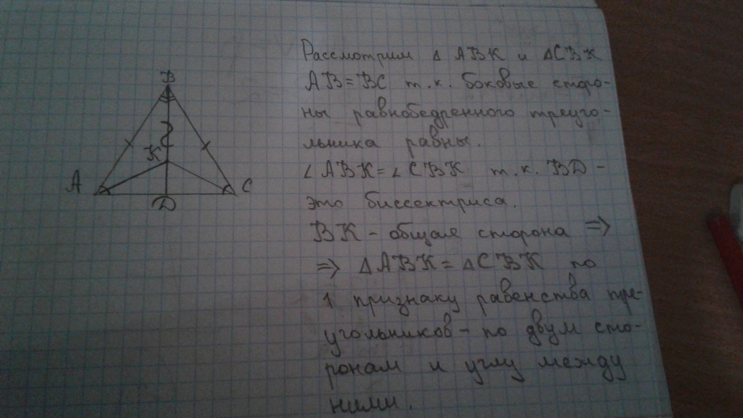 Отрезок AC основание равнобедренного треугольника abc, bd биссектриса этого треугольника, K любая точка, принадлежащая BD. Докажите что треугольники ABK и KBC равны.