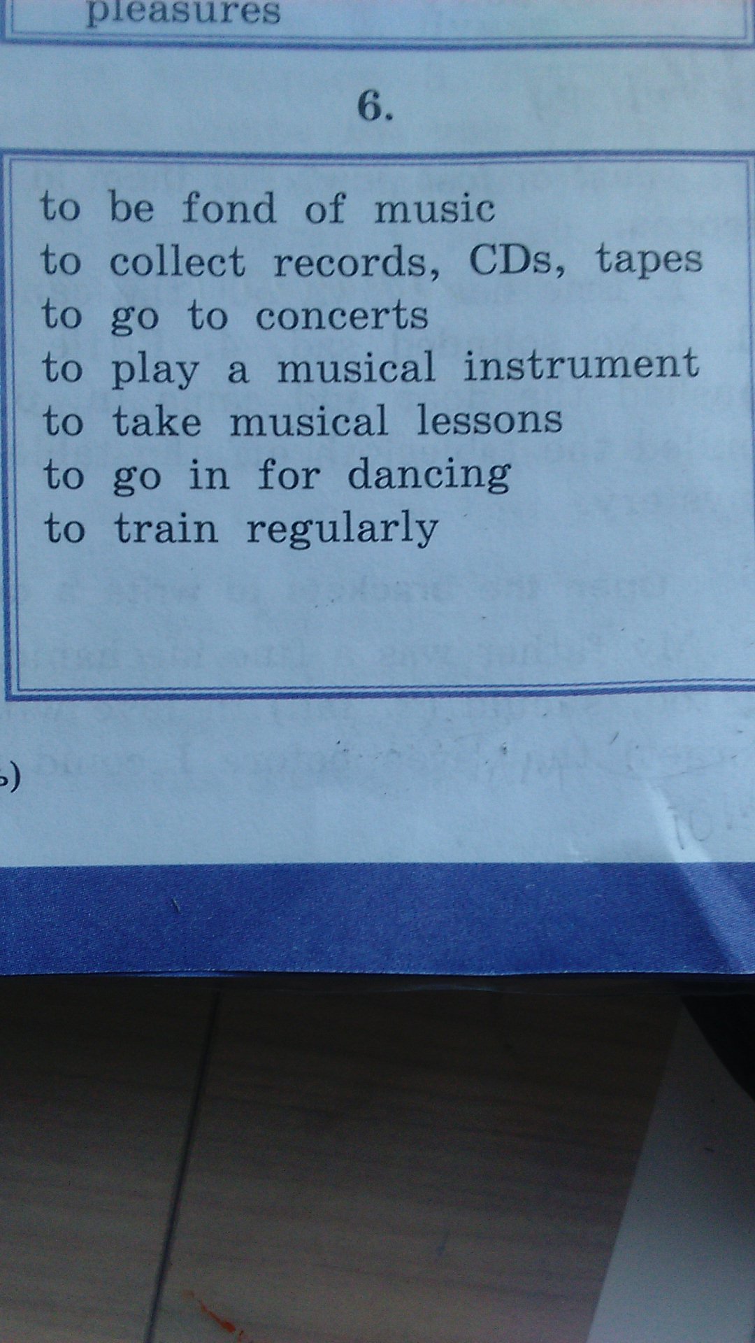 I have playing a musicalinstrument. I love to take musical lesson, I training regularly. I want go to concert, I'm go for dancing