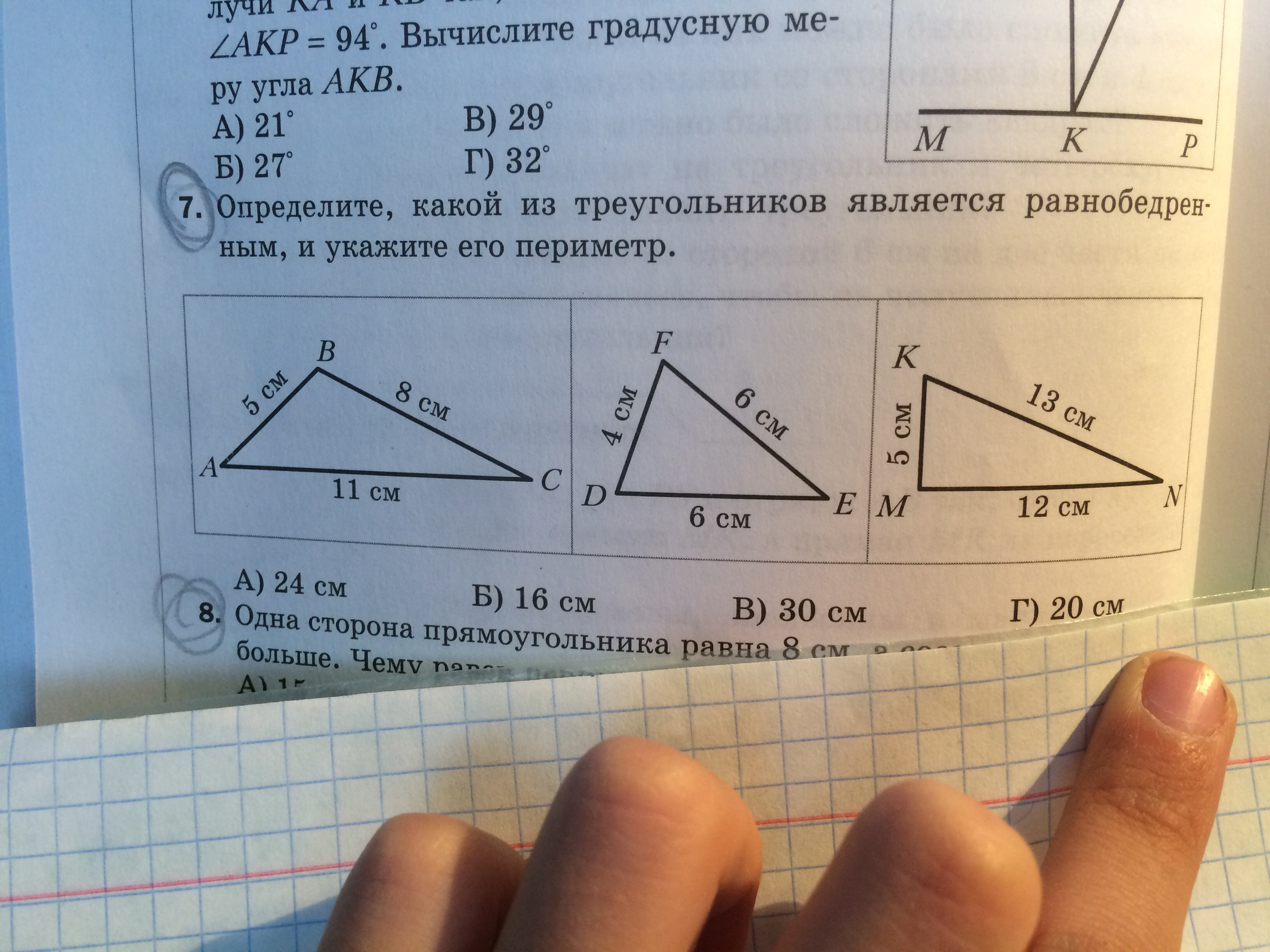 Определите какой из тел конников является равнобедренном и укажите его периметр . Картинки внизу на фото