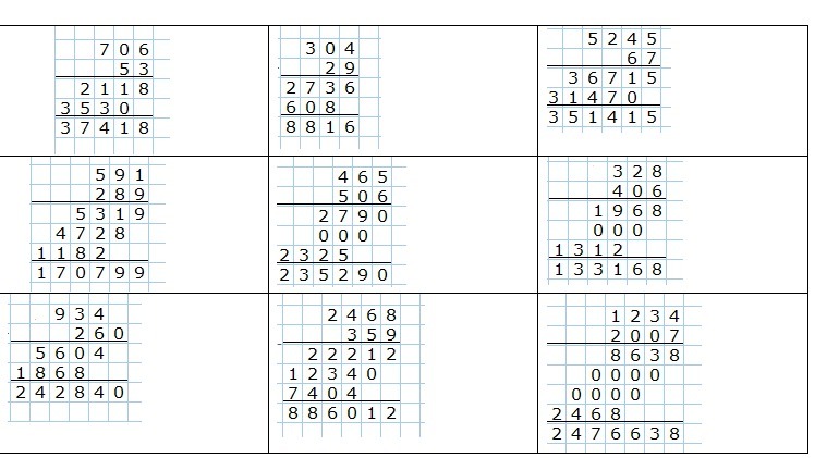 выполните умножение 1) 706×53, 2) 304×29, 3) 5245×67 4) 591×289 5) 465×506 6) 328×406 7) 934×260 8)2468×359 9)1234×2007
