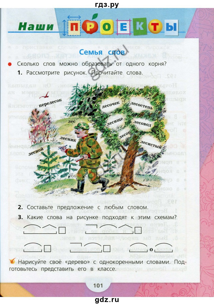 Рисуешь дерево и на нем и вокруг него однокоренные слова пишешь.слова с одним корнем