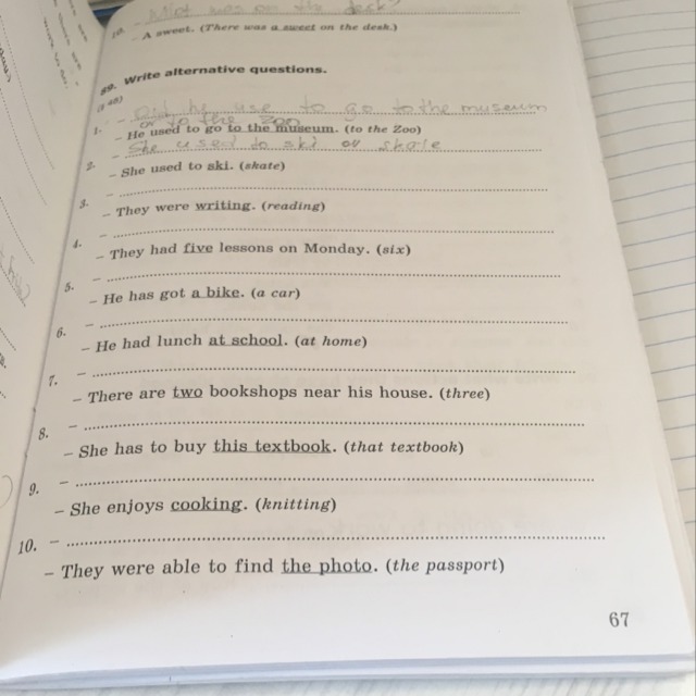 Did she use to ski or skate? Were they writing or reading? Did they have 5 or six lessons on Monday? Yas he got a bike or a car? Did he have lunch at school or at home? Are there two or three bookshops near his house? Has she to buy this book or that one? Does she enjoy cooking or knitting? Were they able to find the photo or a passport?