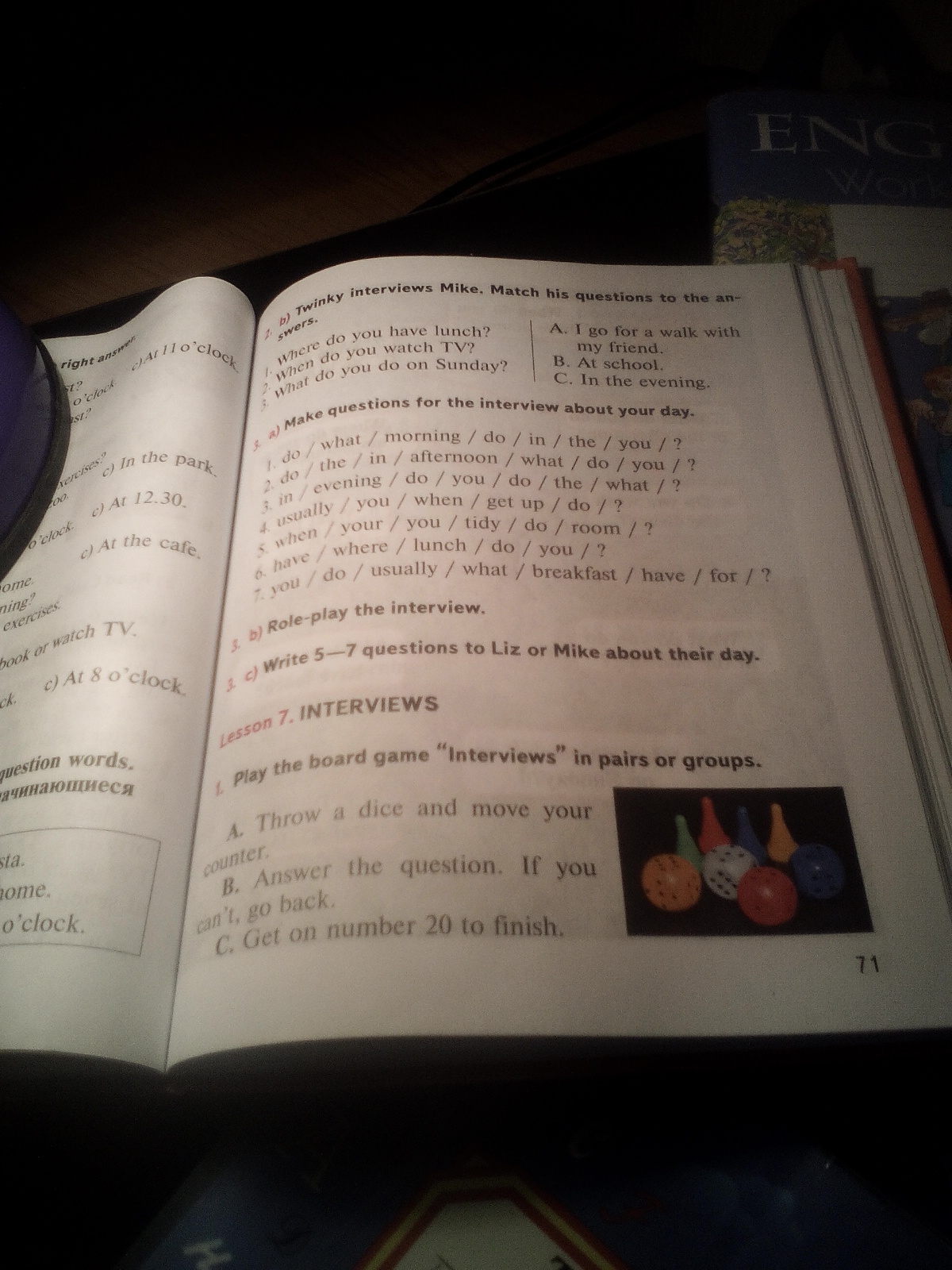 3с напишите 5-7 вопросов к Лиз или Майк об их дне