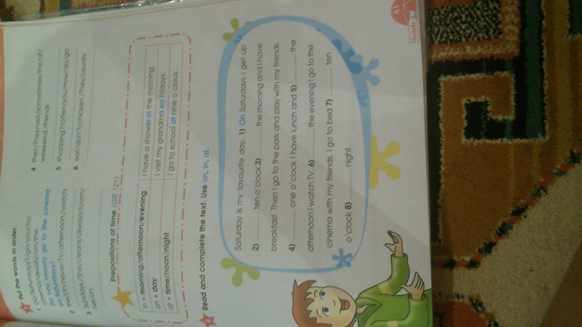 5 at.( если посмотреть чуть выше в твоей книге то там есть правила . afternoon. это определенное время суток . полдник. )