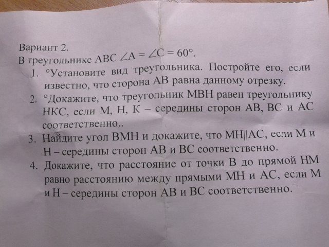 Два угла треугольника по 60 градусов,следовательно третий угол по теореме о сумме углов треугольника тоеж будет 60 градусов.