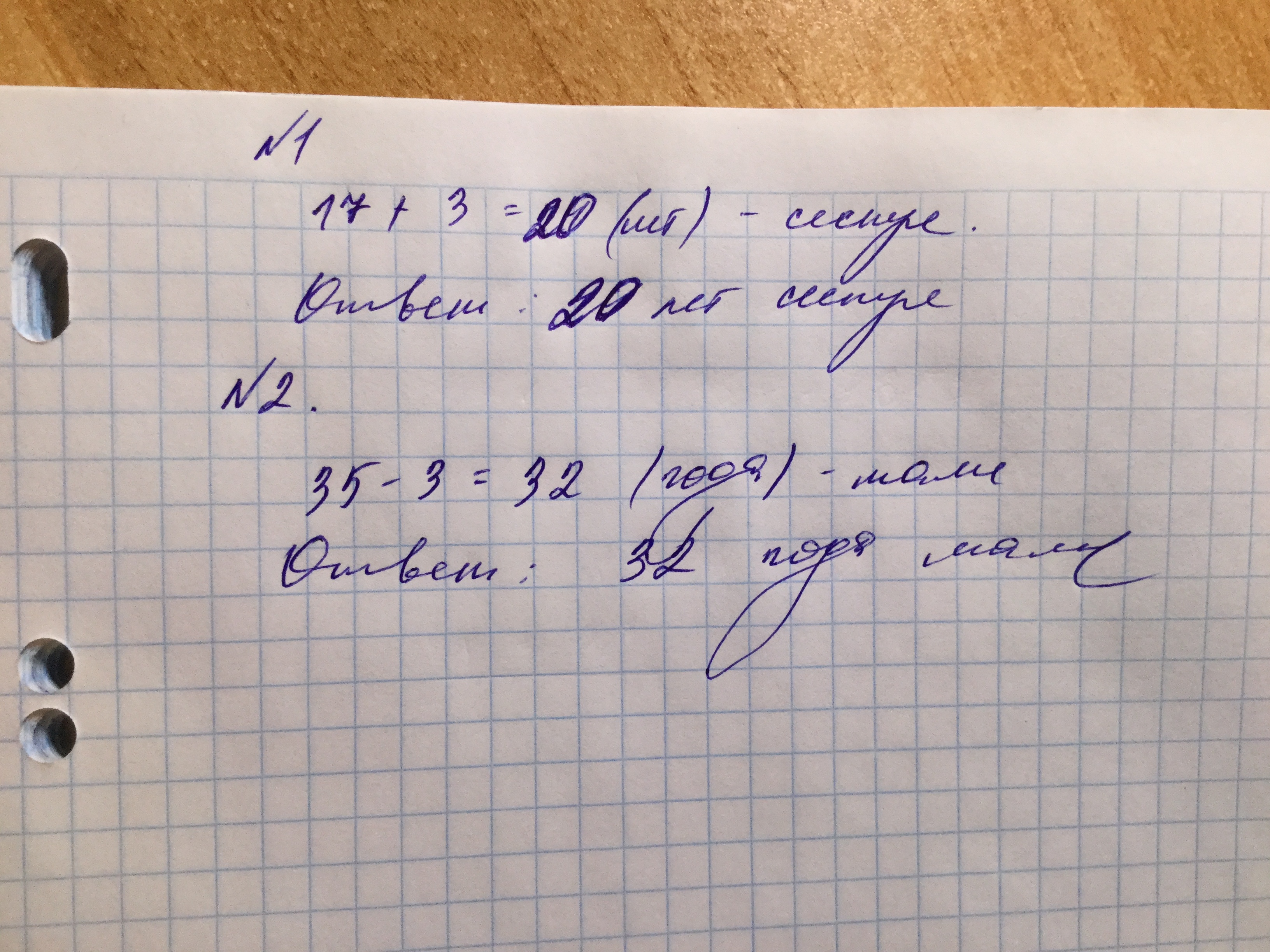 помогите решить две задачи "Брату 17 лет. Он младше сестры на 3 года. Сколько лет сестре?" "Папе 35 лет. Он старше мамы на 3 года. Сколько лет маме?