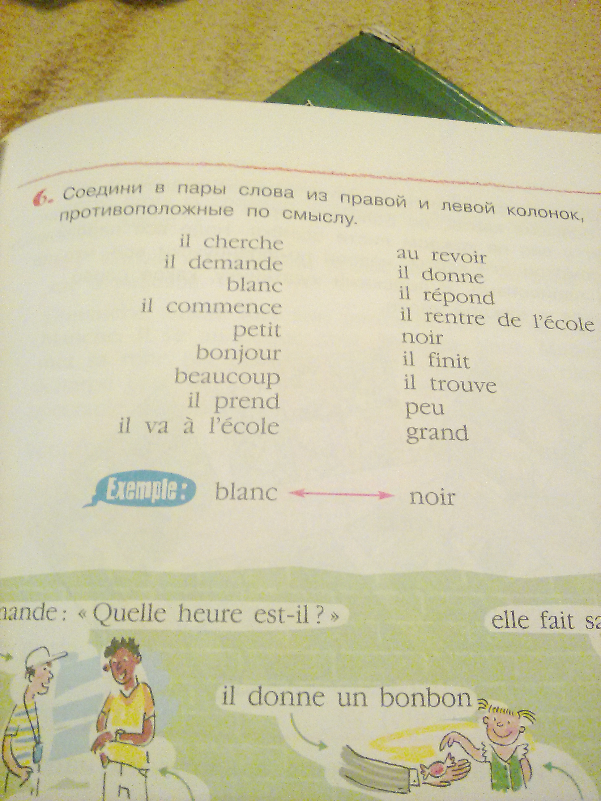 il cherch - il trouve (он ищет - он находит), il demande - il repond (он спрашивает - он отвечает), blanc - noir (белый - черный), il commence - il fini (он начинает - он заканчивает), petit - grand (маленький - большой), bonjour - au revoir (здравствуйте - до свидания), beaucoup -peu (много - мало), il prend - il donne (он берет - он дает), il va à l'école - il rentre de l'école. (он идет в школу - он возвращается из школы)