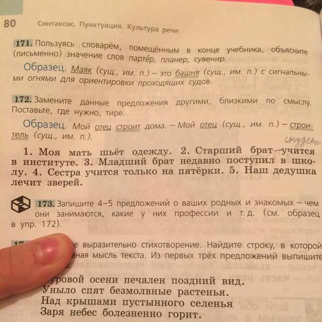 1.Моя мама швея,2. Старший брат студент, 3. Мой младший брат первоклассник, 4. Сестра отличница, 5. Наш дедушка ветеринар.