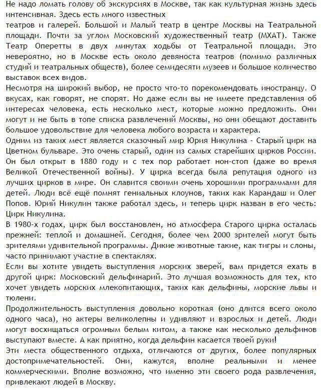 There is no need to rack one's brains about outings in Moscow as the cultural life is intense. A lot of famous theatres and galleries are there. The Bolshoi and the Maly Theatres are in the centre of Moscow in Teatralnaya Square. Just round the corner there is the Moscow Art Theatre (the MkhAT). The Operetta Theatre is a two-minute walk from the Teatralnaya Square as well. It's incredible, but there are about ninety theatres in Moscow (apart from the different studios and theatrical societies), more than seventy museums and a great number of exhibitions of all kinds.