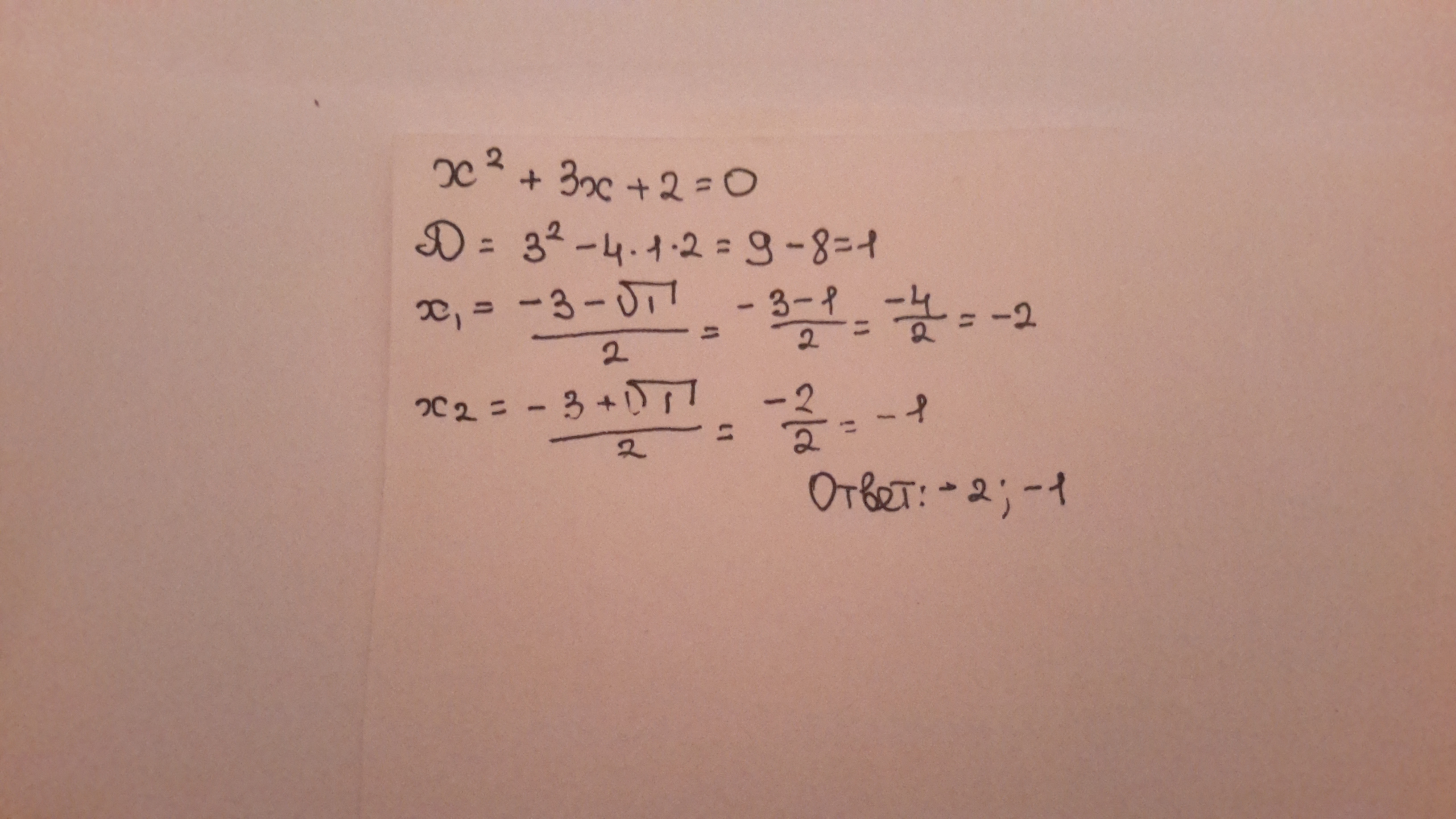 помогите решить квадратные уравнения алгебра 2016 на странице 62 8класс. напишу словами. Икс в квадрате плюс три икс плюс два равно ноль. Надеюсь поймете.