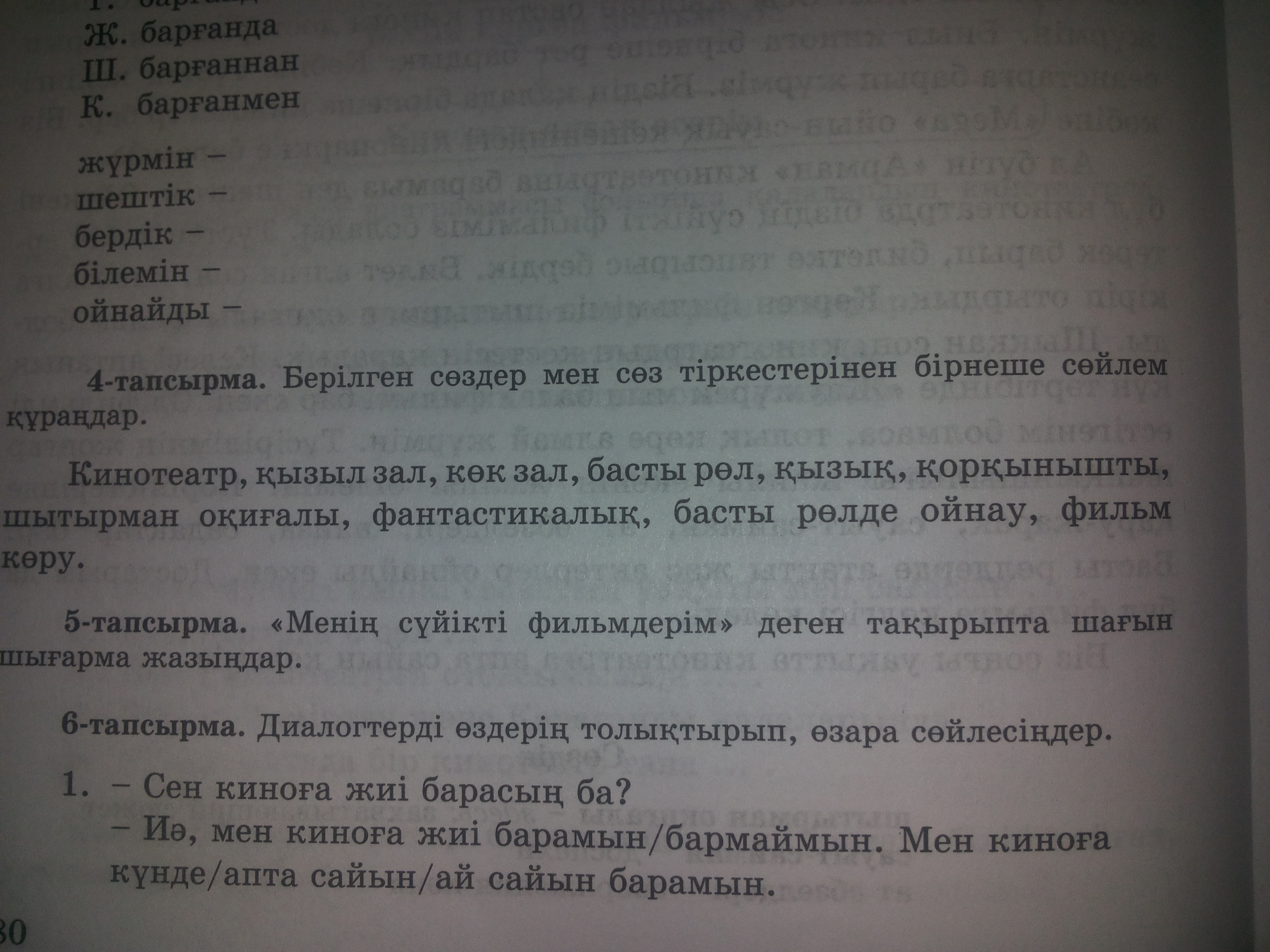 Қалада үш кинотеатр бар. Алматыда Арман кинотеатрында қызыл зал, көк зал болған. Оған режиссер басты рөл берді. Қазіргі фильмдер тартымды, қызық. Мен қорқынышты фильмдерді көрмеймін. Оның өмірі шытырман оқиғалы. Фантастикалық шығармаларды ұнатпаймын. Басты рөлде ойнау мақсатым. Бізге отбасымызбен бірге отырып фильм көру ұнайды.