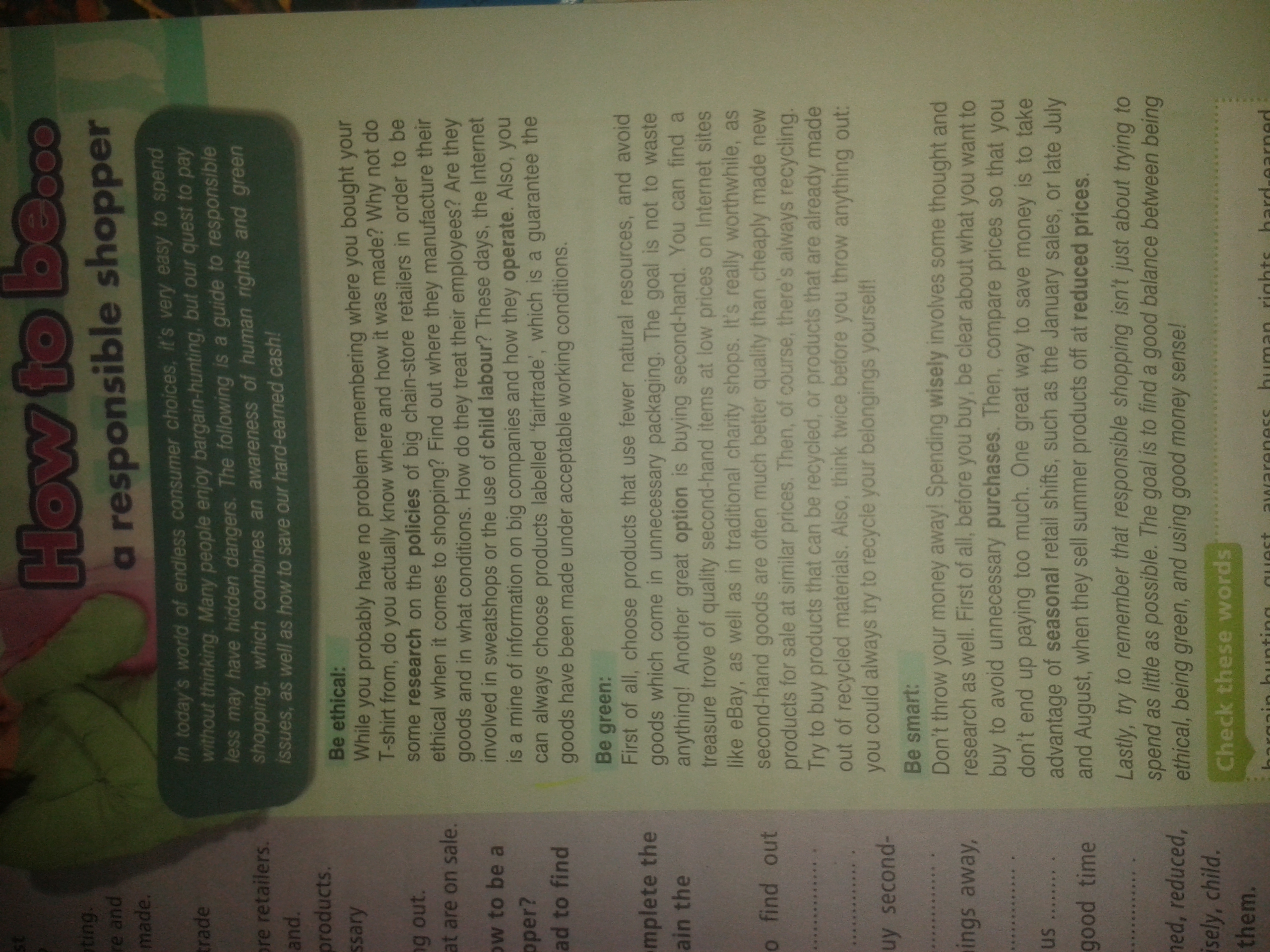 Пока что ты, вероятно, не имеешь проблем с вспоминанием где ты проиобрел свою футболку, знаешь ли ты, на самом деле, где она была сделана. Почему бы не провести некоторое исследование о политике больших сетевых магазинов чтобы быть этичным когда дело доходит до покупок. Выясни где они изготавливают свои товары и в каких условиях. Как они обращаются со своими подчиненными? Вовлечены ли они в sweatshops (я хз что это такое) и в использование детского труда. В наше дни интернет это шахта информации о больших компаниях и как они работают. Также, ты всегда можешь выбрать товары с лейблом "fairdrade" (справедливая торговля) который является гарантией того что товары созданы в приемлемых условиях труда.
