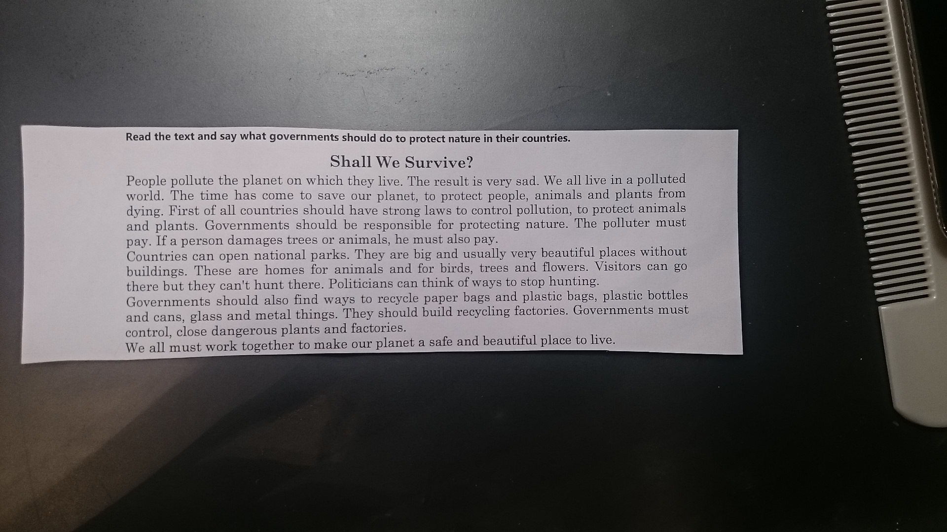 Прочитайте текст и сказать, что правительства должны сделать, чтобы защитить природу в своих странах. нам выжить? Люди загрязняют планету, на которой они живут, Результат очень плохой. все живут в загрязненном мире. Линия пришел, чтобы спасти нашу планету, чтобы защитить peugle, животных и растений от смерти. Сначала все gouшries Шоуда имеют сильные законы у coulrul ра, к люция prnrest животных и Плант, GoverмMeiLls shсuld быть Lesрusible защиты природы. Загрязнитель muЕt платить. Если человек повреждает деревья CR животных, он также должен платить Страны могут открыть национальные парки. Они ошибка и, как правило, очень красивые места без зданий. Это дома для животных и для hiтr., Проследить и цветы. Visiur туда, но они не могут охотиться здесь. Политики могут думать о способах SPOP hunliig. Правительство должно также найти способы переработки бумажных мешков и полиэтиленовых пакетов, пластиковых бутылок и стеклянных и металлических вещей. Они должны строить заводы по переработке. Gavernments должны банки, контроль, близкие опасные заводы и фабрики. Мы все должны работать сообща(вместе) сделать нашу планету БФЭА и красивое место, чтобы жить. дц ЗАКРЫТЬ
