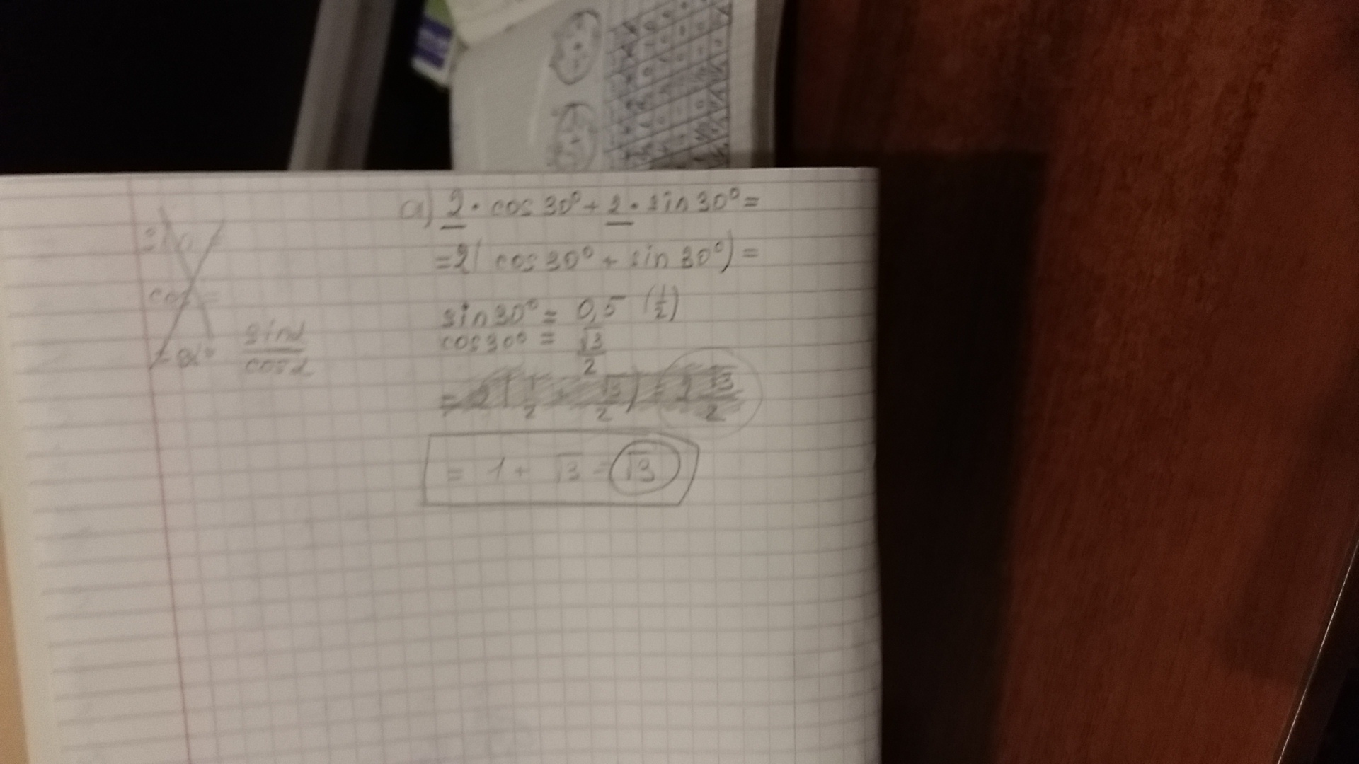 2* cos30°+2*sin30°=2*√3/2+2*1/2=√3+1