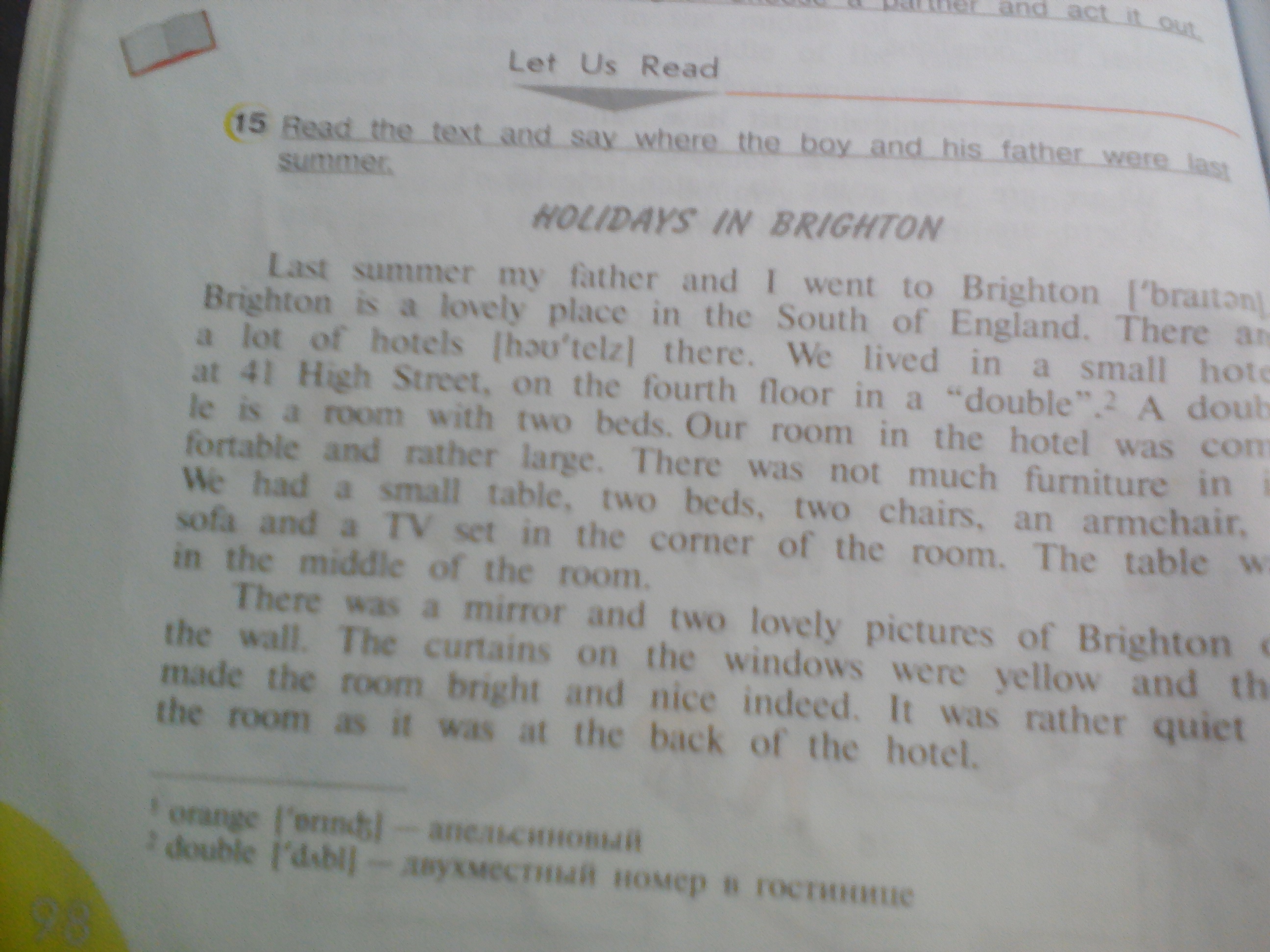 Каникулы в Брайтоне. Прошлым летом мой отец и я отправились в Брайтон. Брайтон-это прекрасное место на юге Англии. Есть много гостиниц в городе. Мы жили в маленькой гостинице на улице 41, на четвертом этаже в "двойной". Двухместный номер с двумя кроватями. Наш номер в отеле был удобным и достаточно большим. Там не было много мебели в нашей комнате. У нас был маленький стол, две кровати, два стула и кресло, диван и телевизор в углу комнаты. Стол был в середине комнаты. Кровать моего отца был слева, а моя была справа у окна. Там было зеркало и две прекрасные фотографии Брайтон на стене. Занавески на окнах были желтые и они сделали номер светлый и хороший. Это было довольно тихо в комнате, как это было в задней части отеля. Ванная была небольшой. Там у нас была ванна, туалет и умывальник. Мы могли бы принять душ в ванной комнате, и обычно я был один во второй половине дня после моего купания в море. Отель был на холме, и вид был прекрасным. Там было много зеленых деревьев и красивых цветов позади отеля и море было перед ним. Мы приехали в Брайтон на машине и провели две замечательные недели. Мы хотим тратить наши следующим летом там снова.