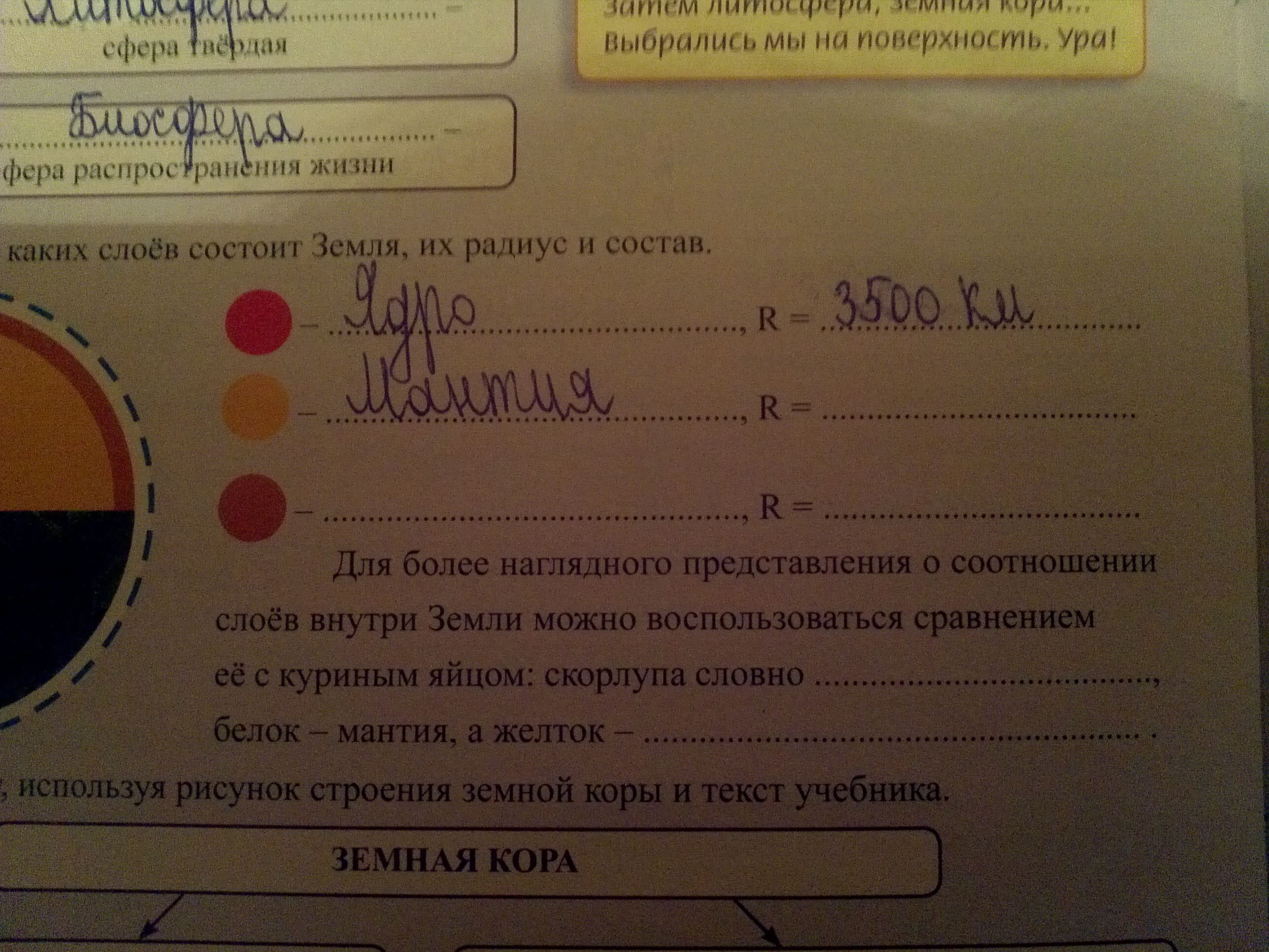 Мантия-2900км, земная кора-океаническая-5-10км, континентальная-35-70км