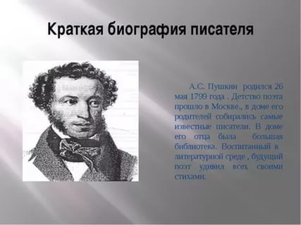 Александр Сергеевич Пушкин родился в Москве. С раннего возраста Пушкин воспитывался в литературной среде. Отец его был, ценителем литературы, имел большую библиотеку, дядя был поэтом. Дом Пушкиных посещали Карамзин, Жуковский, Дмитриев.Общение с бабушкой, с Ариной Родионовной, с дядькой Никитой Козловым подарило много впечатлений юному Пушкину. Отец и дядя решили определить Александра в Царскосельский Лицей, где он и начал учиться в 1811 году. О роли Лицея в становлении личности Пушкина сказано очень много. Вспомним имена друзей, которых Пушкин нашел в Лицее: Иван Пущин, Вильгельм Кюхельбекер, Антон Дельвиг. Они навсегда остались верными и близкими Пушкину друзьями. В Лицее Пушкин начал писать стихи, в 1814 году было опубликовано первое стихотворение «К другу стихотворцу».После окончания Лицея Пушкин не возвратился в Москву, в 1817 году он переехал в Петербург и был зачислен на службу в Коллегию иностранных дел. В Петербурге он общался в светском обществе, в литературном окружении, посещал балы, театры. В 1820 году он закончил поэму «Руслан и Людмила» — первое крупное произведение.За эпиграммы, вольные стихи, быстро распространявшиеся по Петербургу, в 1820 году Пушкин был отправлен в южную ссылку. За четыре года он переезжал в разные города: Екатеринослав, Кишинев, Одессу. Во время этой ссылки им были написаны романтические южные поэмы «Кавказский пленник», «Бахчисарайский фонтан», «Братья разбойники», а в 1823 году он начал работу над романом в стихах «Евгений Онегин».В 1824 году Пушкин был отправлен в северную ссылку в имение родителей Михайловское, где после отъезда семьи жил с няней. Там он продолжал работу над «Евгением Онегиным», писал «Бориса Годунова», стихотворения. Там, в Михайловском, навещали его друзья, туда Пущин привез Пушкину «Горе от ума», находясь там, Пушкин вел переписку. Там застало его известие о восстании декабристов, в котором участвовали многие его друзья, и об их казни.4 сентября 1826 года Николай 1 неожиданно вызвал Пушкина в Москву. Но свобода, предоставленная царем, была недолгой. Уже в 1328 году вышло постановление Государственного совета о надзоре над Пушкиным. В этом же году он самовольно уехал на Кавказ, где служили его друзья.В 1830 году Пушкин посватался к Н. Гончаровой. Перед женитьбой он уехал в имение в Болдино, где вынужден был задержаться из-за карантина. Этот период в творчестве Пушкина называют Болдинской осенью, в течение которой он написал большое количество литературных произведений самых разных жанров.15 мая.1831 года Пушкин женился и переехал в Петербург. В эти годы он много работал в архивах, писал произведения на исторические темы. Это «Дубровский», «Капитанская дочка», «История Пугачева». Пушкин журнал «Современник», был его редактором, общался Белинским, Гоголем, с художниками.Затруднения возникли вновь, когда Пушкин вынужден был общаться в придворных кругах. 9 февраля 1837 года Пушкин стрелялся на дуэли с Дантесом, был смертельно и скончался 10 февраля в своем доме на Мойке.