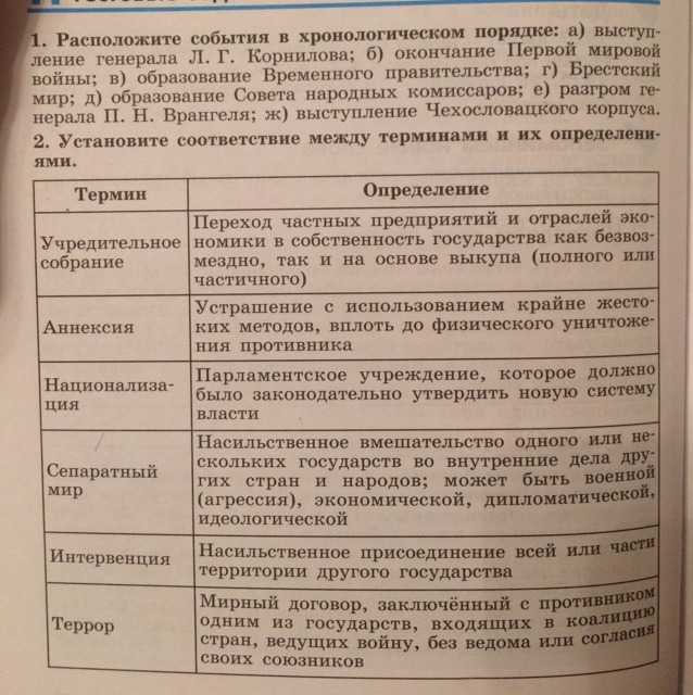национализация, террор, учредительное собрание,интервенция,аннексия, сепаратный мир.