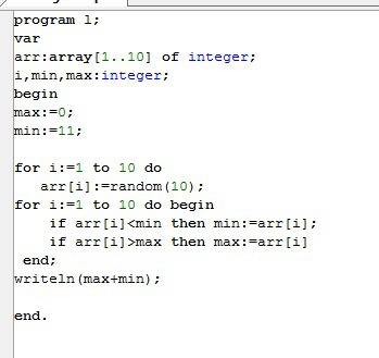 составьте программу, которая заполняет массив a[1..10] случайными целыми числами в диапазоне от 0 до 10 и находит сумму минимального и максимального элементов массива.