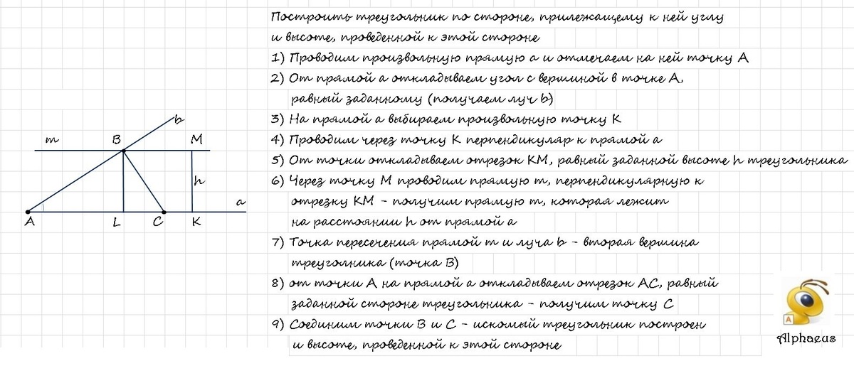 ПОСТРОЙТЕ ТРЕУГОЛЬНИК ПО СТОРОНЕ,ПРИЛЕЖАЩЕМУ К НЕЙ УГЛУ И ВЫСОТЕ,ПРОВЕДЕННОЙ К ЭТОЙ СТОРОНЕ.